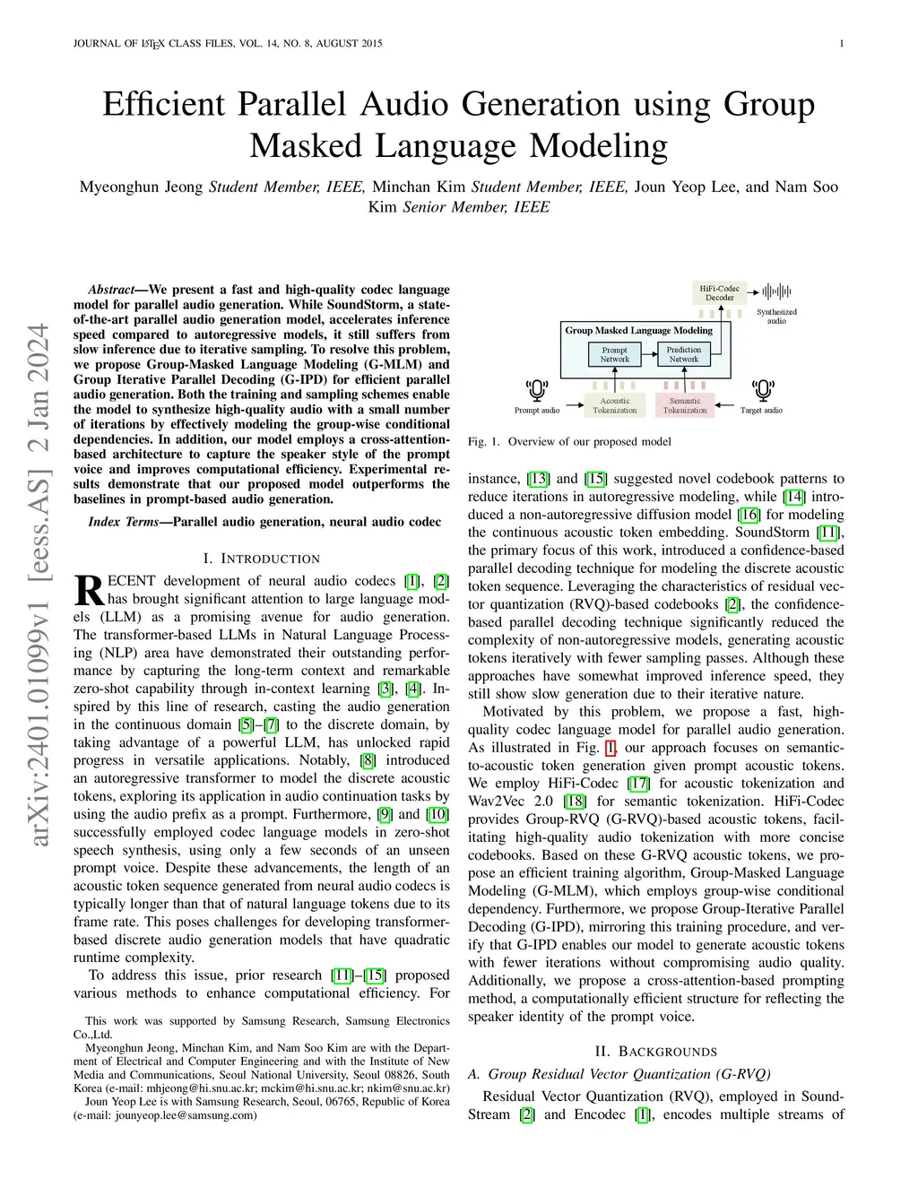 Efficient Parallel Audio Generation using Group Masked Language Modeling