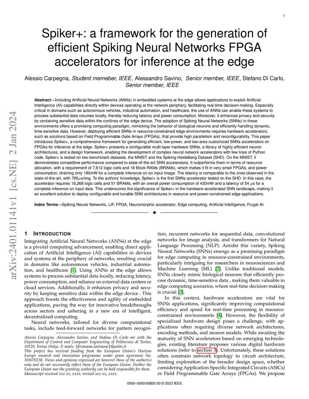 Including Artificial Neural Networks in embedded systems at the edge allows applications to exploit Artificial Intelligence capabilities directly within devices operating at the network periphery. This paper introduces Spiker+, a comprehensive framework for generating efficient, low-power, and low-area customized Spiking Neural Networks (SNN) accelerators on FPGA for inference at the edge. Spiker+ presents a configurable multi-layer hardware SNN, a library of highly efficient neuron architectures, and a design framework, enabling the development of complex neural network accelerators with few lines of Python code. Spiker+ is tested on two benchmark datasets, the MNIST and the Spiking Heidelberg Digits (SHD). On the MNIST, it demonstrates competitive performance compared to state-of-the-art SNN accelerators. It outperforms them in terms of resource allocation, with a requirement of 7,612 logic cells and 18 Block RAMs (BRAMs), which makes it fit in very small FPGA, and power consumption, draining only 180mW for a complete inference on an input image. The latency is comparable to the ones observed in the state-of-the-art, with 780us/img. To the authors' knowledge, Spiker+ is the first SNN accelerator tested on the SHD. In this case, the accelerator requires 18,268 logic cells and 51 BRAM, with an overall power consumption of 430mW and a latency of 54 us for a complete inference on input data. This underscores the significance of Spiker+ in the hardware-accelerated SNN landscape, making it an excellent solution to deploy configurable and tunable SNN architectures in resource and power-constrained edge applications.