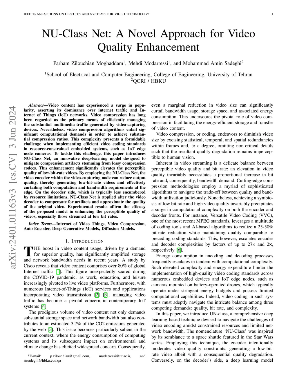 Video content has experienced a surge in popularity, asserting its dominance over internet traffic and Internet of Things (IoT) networks. Video compression has long been regarded as the primary means of efficiently managing the substantial multimedia traffic generated by video-capturing devices. Nevertheless, video compression algorithms entail significant computational demands in order to achieve substantial compression ratios. This complexity presents a formidable challenge when implementing efficient video coding standards in resource-constrained embedded systems, such as IoT edge node cameras. To tackle this challenge, this paper introduces NU-Class Net, an innovative deep-learning model designed to mitigate compression artifacts stemming from lossy compression codecs. This enhancement significantly elevates the perceptible quality of low-bit-rate videos. By employing the NU-Class Net, the video encoder within the video-capturing node can reduce output quality, thereby generating low-bit-rate videos and effectively curtailing both computation and bandwidth requirements at the edge. On the decoder side, which is typically less encumbered by resource limitations, NU-Class Net is applied after the video decoder to compensate for artifacts and approximate the quality of the original video. Experimental results affirm the efficacy of the proposed model in enhancing the perceptible quality of videos, especially those streamed at low bit rates.