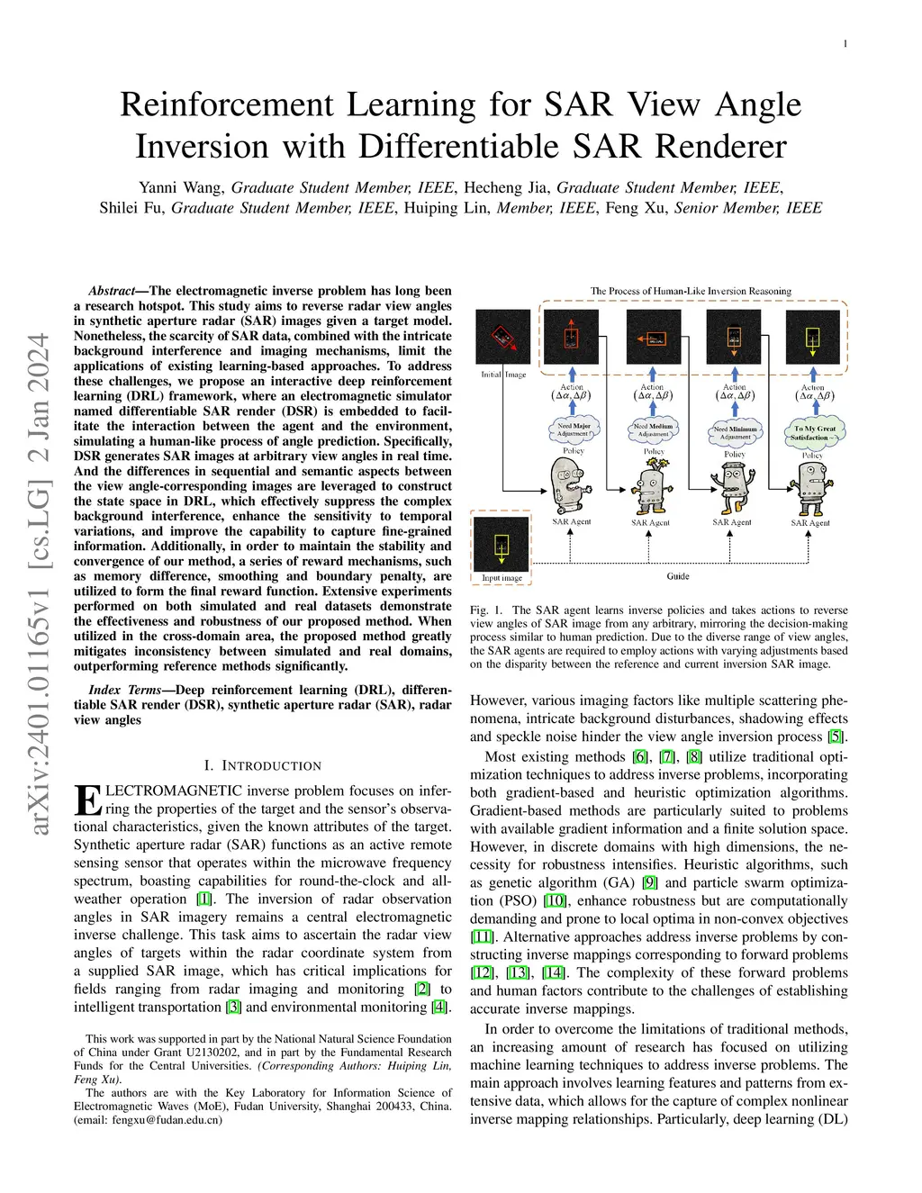 The electromagnetic inverse problem has long been a research hotspot. This study aims to reverse radar view angles in synthetic aperture radar (SAR) images given a target model. Nonetheless, the scarcity of SAR data, combined with the intricate background interference and imaging mechanisms, limit the applications of existing learning-based approaches. To address these challenges, we propose an interactive deep reinforcement learning (DRL) framework, where an electromagnetic simulator named differentiable SAR render (DSR) is embedded to facilitate the interaction between the agent and the environment, simulating a human-like process of angle prediction. Specifically, DSR generates SAR images at arbitrary view angles in real-time. And the differences in sequential and semantic aspects between the view angle-corresponding images are leveraged to construct the state space in DRL, which effectively suppress the complex background interference, enhance the sensitivity to temporal variations, and improve the capability to capture fine-grained information. Additionally, in order to maintain the stability and convergence of our method, a series of reward mechanisms, such as memory difference, smoothing and boundary penalty, are utilized to form the final reward function. Extensive experiments performed on both simulated and real datasets demonstrate the effectiveness and robustness of our proposed method. When utilized in the cross-domain area, the proposed method greatly mitigates inconsistency between simulated and real domains, outperforming reference methods significantly.