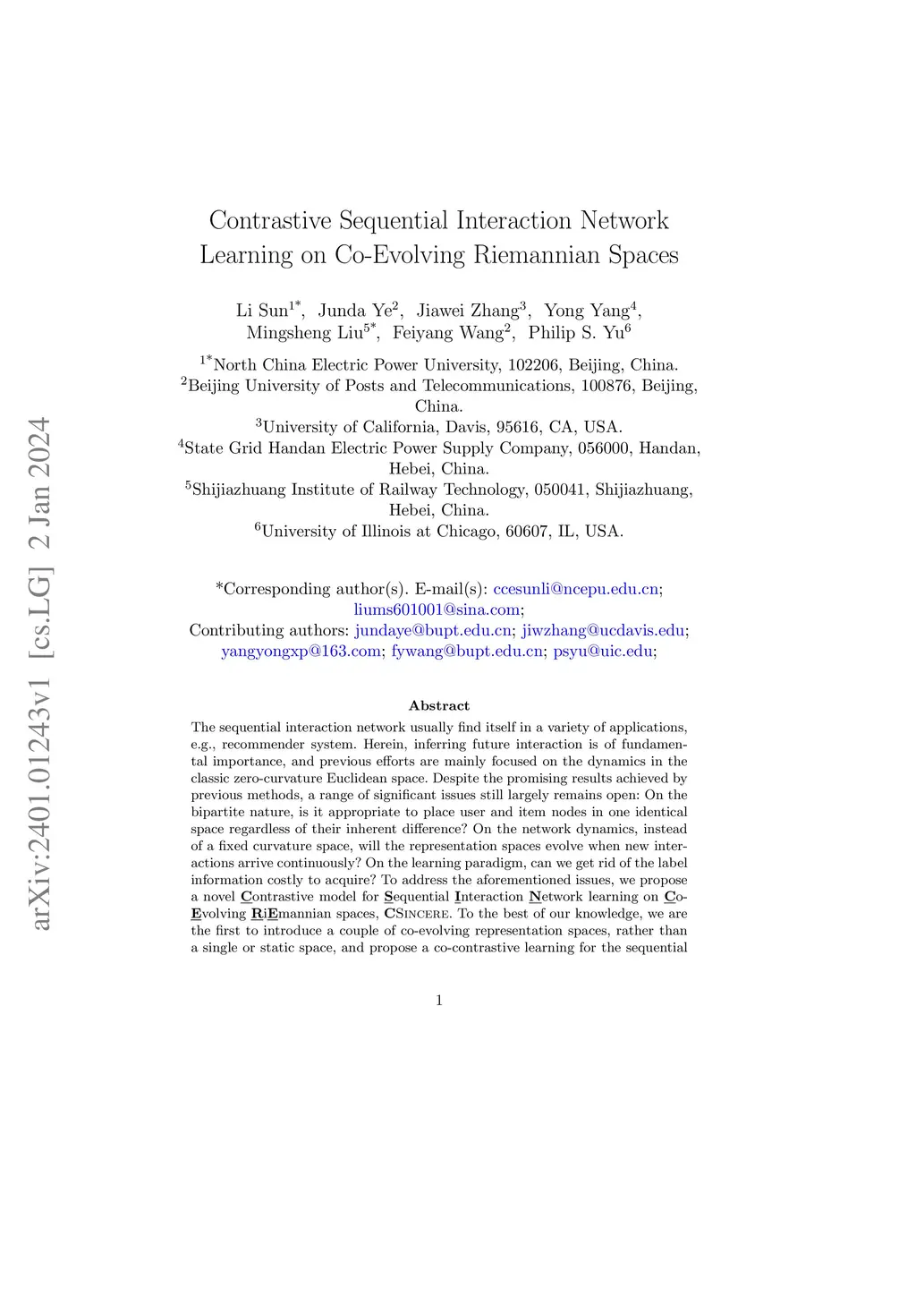 The sequential interaction network usually find itself in a variety of applications, e.g., recommender system. Herein, inferring future interaction is of fundamental importance, and previous efforts are mainly focused on the dynamics in the classic zero-curvature Euclidean space. Despite the promising results achieved by previous methods, a range of significant issues still largely remains open: On the bipartite nature, is it appropriate to place user and item nodes in one identical space regardless of their inherent difference? On the network dynamics, instead of a fixed curvature space, will the representation spaces evolve when new interactions arrive continuously? On the learning paradigm, can we get rid of the label information costly to acquire? To address the aforementioned issues, we propose a novel Contrastive model for Sequential Interaction Network learning on Co-Evolving RiEmannian spaces, CSINCERE. To the best of our knowledge, we are the first to introduce a couple of co-evolving representation spaces, rather than a single or static space, and propose a co-contrastive learning for the sequential interaction network. In CSINCERE, we formulate a Cross-Space Aggregation for message-passing across representation spaces of different Riemannian geometries, and design a Neural Curvature Estimator based on Ricci curvatures for modeling the space evolvement over time. Thereafter, we present a Reweighed Co-Contrast between the temporal views of the sequential network, so that the couple of Riemannian spaces interact with each other for the interaction prediction without labels. Empirical results on 5 public datasets show the superiority of CSINCERE over the state-of-the-art methods.