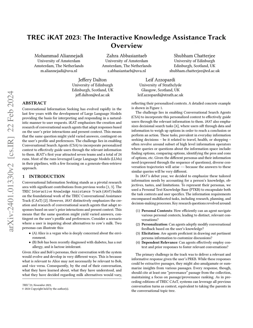 Conversational Information Seeking has evolved rapidly in the last few years with the development of Large Language Models providing the basis for interpreting and responding in a naturalistic manner to user requests. iKAT emphasizes the creation and research of conversational search agents that adapt responses based on the user's prior interactions and present context. This means that the same question might yield varied answers, contingent on the user's profile and preferences. The challenge lies in enabling Conversational Search Agents (CSA) to incorporate personalized context to effectively guide users through the relevant information to them. iKAT's first year attracted seven teams and a total of 24 runs. Most of the runs leveraged Large Language Models (LLMs) in their pipelines, with a few focusing on a generate-then-retrieve approach.