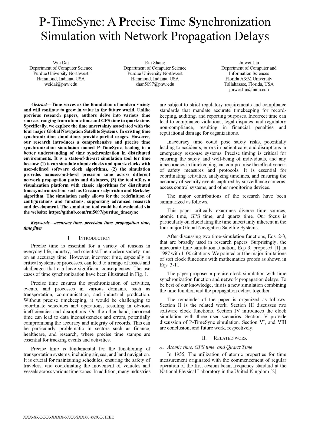 Time serves as the foundation of modern society and will continue to grow in value in the future world. Unlike previous research papers, authors delve into various time sources, ranging from atomic time and GPS time to quartz time. Specifically, we explore the time uncertainty associated with the four major Global Navigation Satellite Systems. In existing time synchronization simulations provide partial usages. However, our research introduces a comprehensive and precise time synchronization simulation named P-TimeSync, leading to a better understanding of time synchronization in distributed environments. It is a state-of-the-art simulation tool for time because (1) it can simulate atomic clocks and quartz clocks with user-defined software clock algorithms, (2) the simulation provides nanosecond-level precision time across different network propagation paths and distances, (3) the tool offers a visualization platform with classic algorithms for distributed time synchronization, such as Cristian's algorithm and Berkeley algorithm. The simulation easily allows for the redefinition of configurations and functions, supporting advanced research and development. The simulation tool could be downloaded via the website: https://github.com/rui5097/purdue_timesync