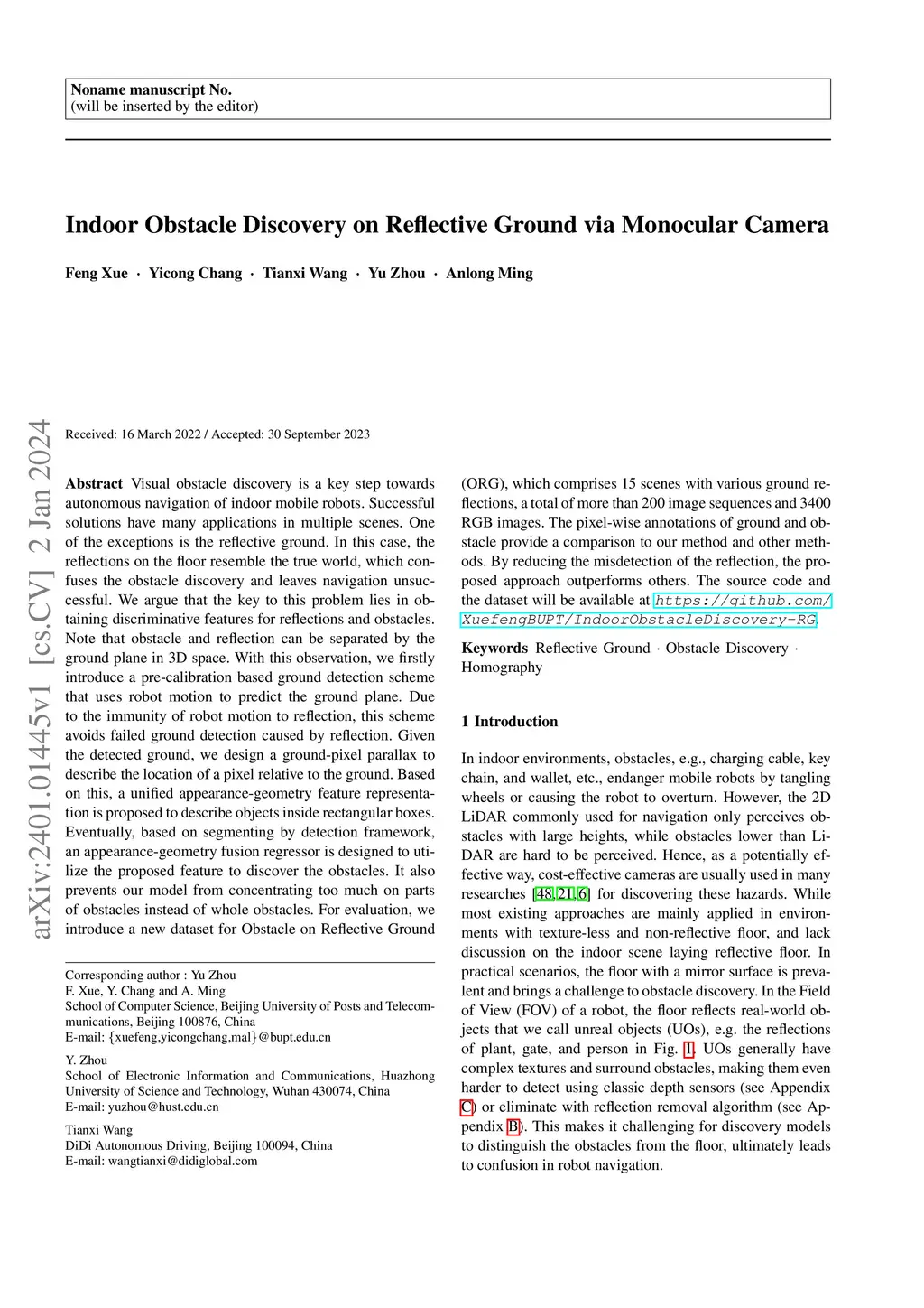 Indoor Obstacle Discovery on Reflective Ground via Monocular Camera