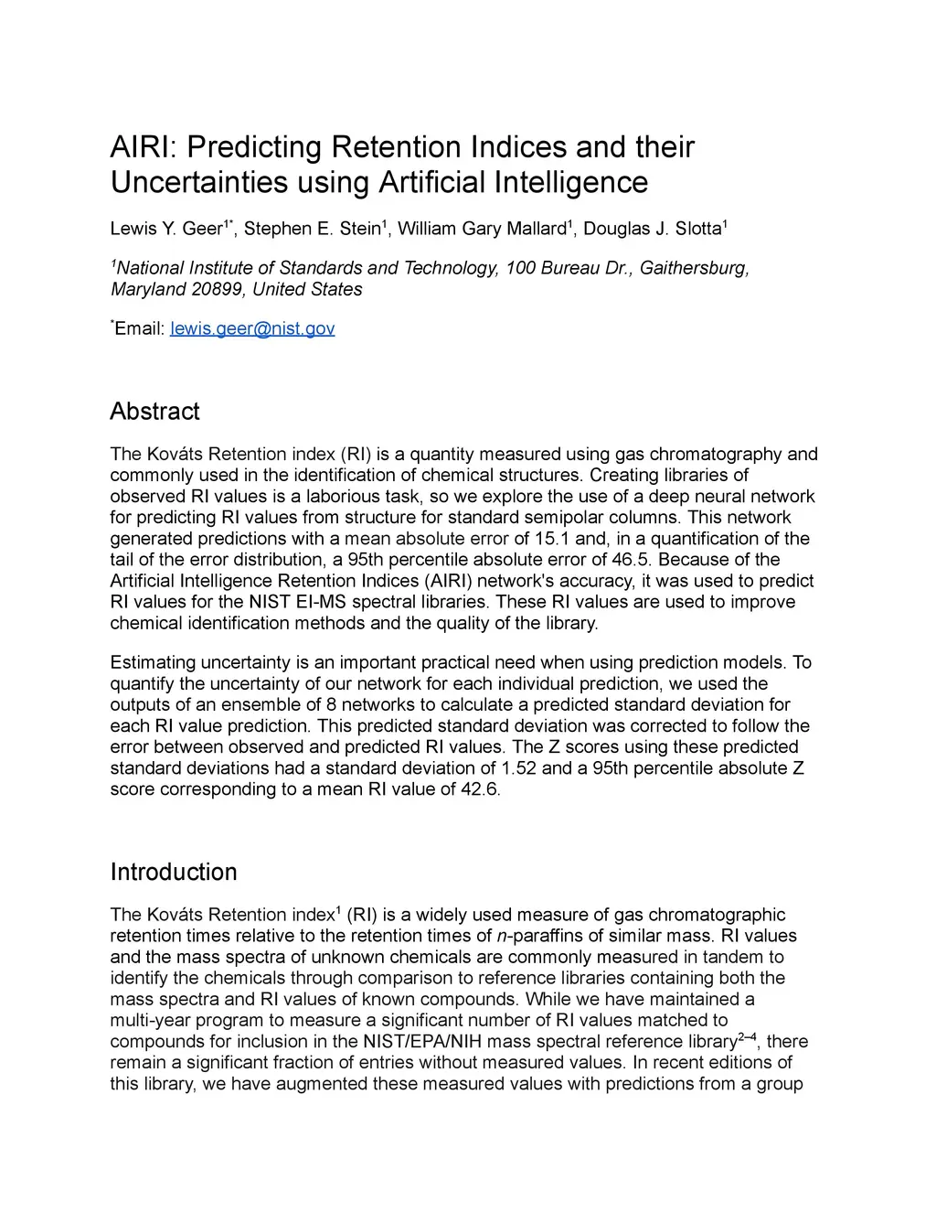 The Kov\áts Retention index (RI) is a quantity measured using gas chromatography and commonly used in the identification of chemical structures. Creating libraries of observed RI values is a laborious task, so we explore the use of a deep neural network for predicting RI values from structure for standard semipolar columns. This network generated predictions with a mean absolute error of 15.1 and, in a quantification of the tail of the error distribution, a 95th percentile absolute error of 46.5. Because of the Artificial Intelligence Retention Indices (AIRI) network's accuracy, it was used to predict RI values for the NIST EI-MS spectral libraries. These RI values are used to improve chemical identification methods and the quality of the library. Estimating uncertainty is an important practical need when using prediction models. To quantify the uncertainty of our network for each individual prediction, we used the outputs of an ensemble of 8 networks to calculate a predicted standard deviation for each RI value prediction. This predicted standard deviation was corrected to follow the error between observed and predicted RI values. The Z scores using these predicted standard deviations had a standard deviation of 1.52 and a 95th percentile absolute Z score corresponding to a mean RI value of 42.6.