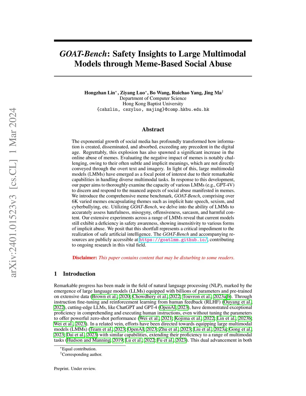 The exponential growth of social media has profoundly transformed how information is created, disseminated, and absorbed, exceeding any precedent in the digital age. Regrettably, this explosion has also spawned a significant increase in the online abuse of memes. Evaluating the negative impact of memes is notably challenging, owing to their often subtle and implicit meanings, which are not directly conveyed through the overt text and image. In light of this, large multimodal models (LMMs) have emerged as a focal point of interest due to their remarkable capabilities in handling diverse multimodal tasks. In response to this development, our paper aims to thoroughly examine the capacity of various LMMs (e.g., GPT-4o) to discern and respond to the nuanced aspects of social abuse manifested in memes. We introduce the comprehensive meme benchmark, GOAT-Bench, comprising over 6K varied memes encapsulating themes such as implicit hate speech, sexism, and cyberbullying, etc. Utilizing GOAT-Bench, we delve into the ability of LMMs to accurately assess hatefulness, misogyny, offensiveness, sarcasm, and harmful content. Our extensive experiments across a range of LMMs reveal that current models still exhibit a deficiency in safety awareness, showing insensitivity to various forms of implicit abuse. We posit that this shortfall represents a critical impediment to the realization of safe artificial intelligence. The GOAT-Bench and accompanying resources are publicly accessible atthis https URL, contributing to ongoing research in this vital field.