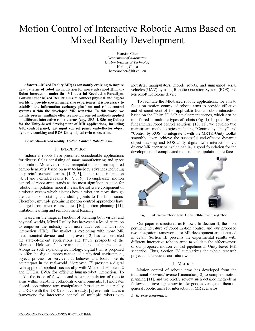 Mixed Reality (MR) is constantly evolving to inspire new patterns of robot manipulation for more advanced Human- Robot Interaction under the 4th Industrial Revolution Paradigm. Consider that Mixed Reality aims to connect physical and digital worlds to provide special immersive experiences, it is necessary to establish the information exchange platform and robot control systems within the developed MR scenarios. In this work, we mainly present multiple effective motion control methods applied on different interactive robotic arms (e.g., UR5, UR5e, myCobot) for the Unity-based development of MR applications, including GUI control panel, text input control panel, end-effector object dynamic tracking and ROS-Unity digital-twin connection.