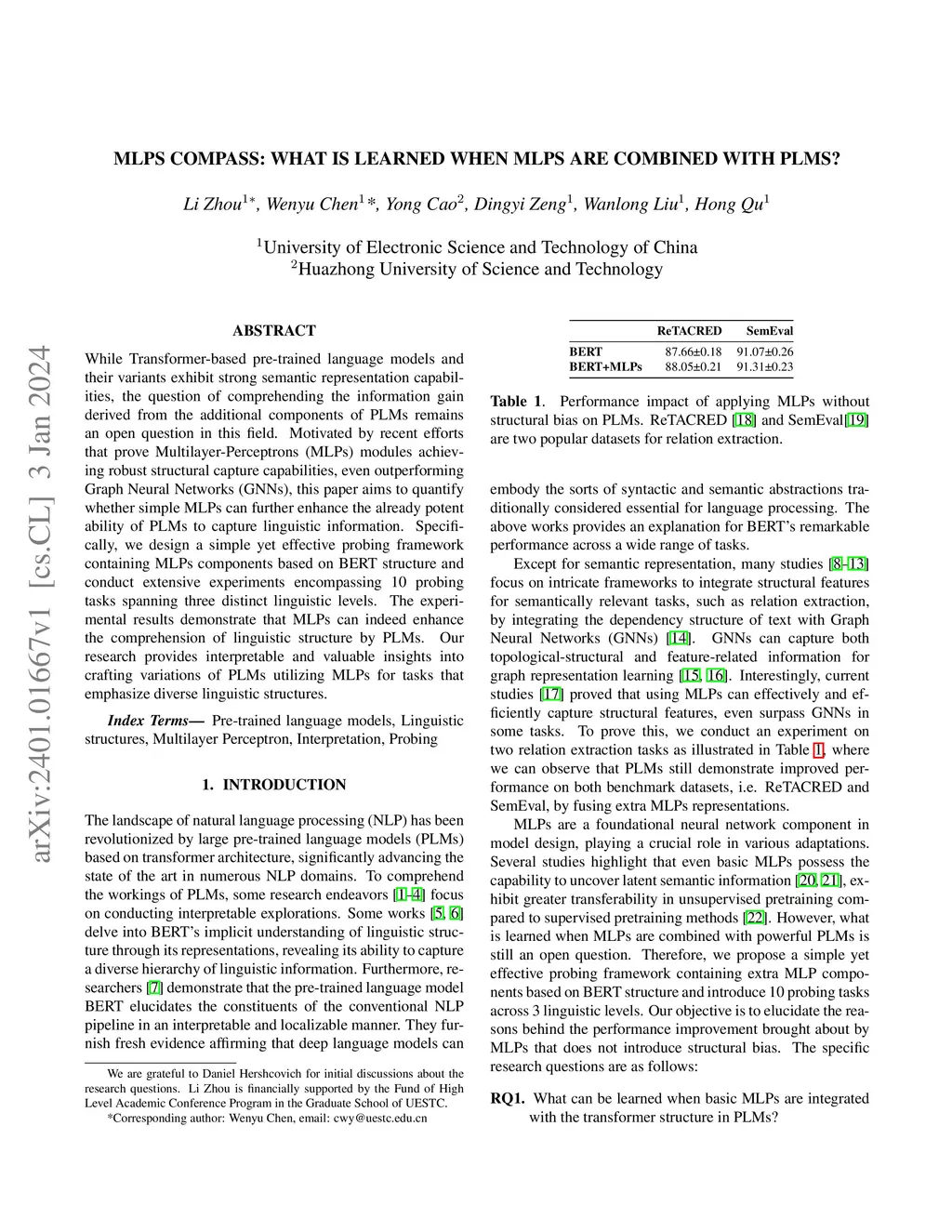 While Transformer-based pre-trained language models and their variants exhibit strong semantic representation capabilities, the question of comprehending the information gain derived from the additional components of PLMs remains an open question in this field. Motivated by recent efforts that prove Multilayer-Perceptrons (MLPs) modules achieving robust structural capture capabilities, even outperforming Graph Neural Networks (GNNs), this paper aims to quantify whether simple MLPs can further enhance the already potent ability of PLMs to capture linguistic information. Specifically, we design a simple yet effective probing framework containing MLPs components based on BERT structure and conduct extensive experiments encompassing 10 probing tasks spanning three distinct linguistic levels. The experimental results demonstrate that MLPs can indeed enhance the comprehension of linguistic structure by PLMs. Our research provides interpretable and valuable insights into crafting variations of PLMs utilizing MLPs for tasks that emphasize diverse linguistic structures.