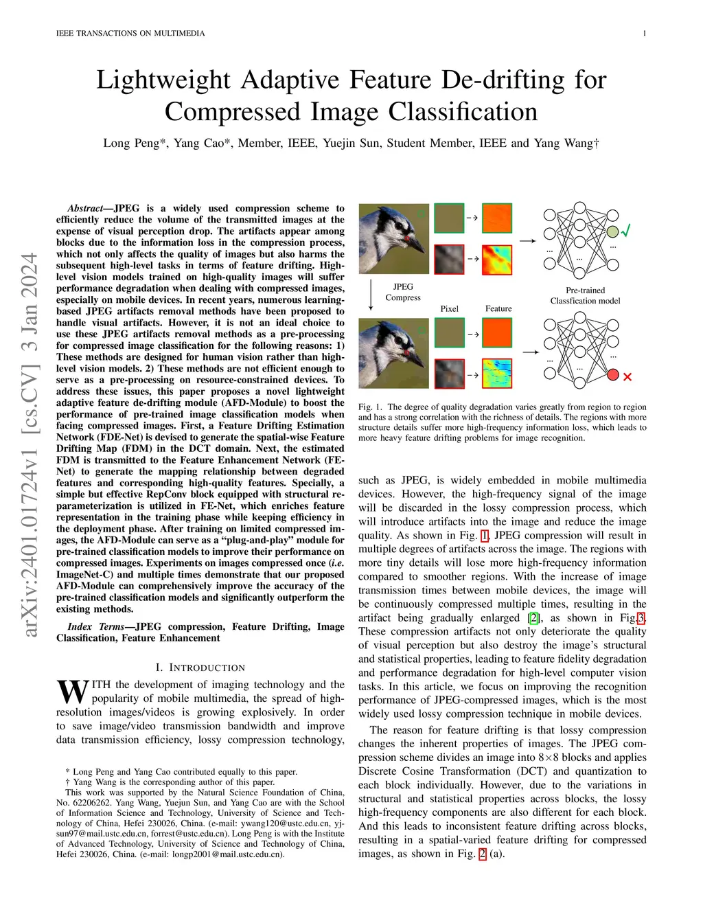 JPEG is a widely used compression scheme to efficiently reduce the volume of transmitted images. The artifacts appear among blocks due to the information loss, which not only affects the quality of images but also harms the subsequent high-level tasks in terms of feature drifting. High-level vision models trained on high-quality images will suffer performance degradation when dealing with compressed images, especially on mobile devices. Numerous learning-based JPEG artifact removal methods have been proposed to handle visual artifacts. However, it is not an ideal choice to use these JPEG artifact removal methods as a pre-processing for compressed image classification for the following reasons: 1. These methods are designed for human vision rather than high-level vision models; 2. These methods are not efficient enough to serve as pre-processing on resource-constrained devices. To address these issues, this paper proposes a novel lightweight AFD module to boost the performance of pre-trained image classification models when facing compressed images. First, a FDE-Net is devised to generate the spatial-wise FDM in the DCT domain. Next, the estimated FDM is transmitted to the FE-Net to generate the mapping relationship between degraded features and corresponding high-quality features. A simple but effective RepConv block equipped with structural re-parameterization is utilized in FE-Net, which enriches feature representation in the training phase while maintaining efficiency in the deployment phase. After training on limited compressed images, the AFD-Module can serve as a "plug-and-play" model for pre-trained classification models to improve their performance on compressed images. Experiments demonstrate that our proposed AFD module can comprehensively improve the accuracy of the pre-trained classification models and significantly outperform the existing methods.