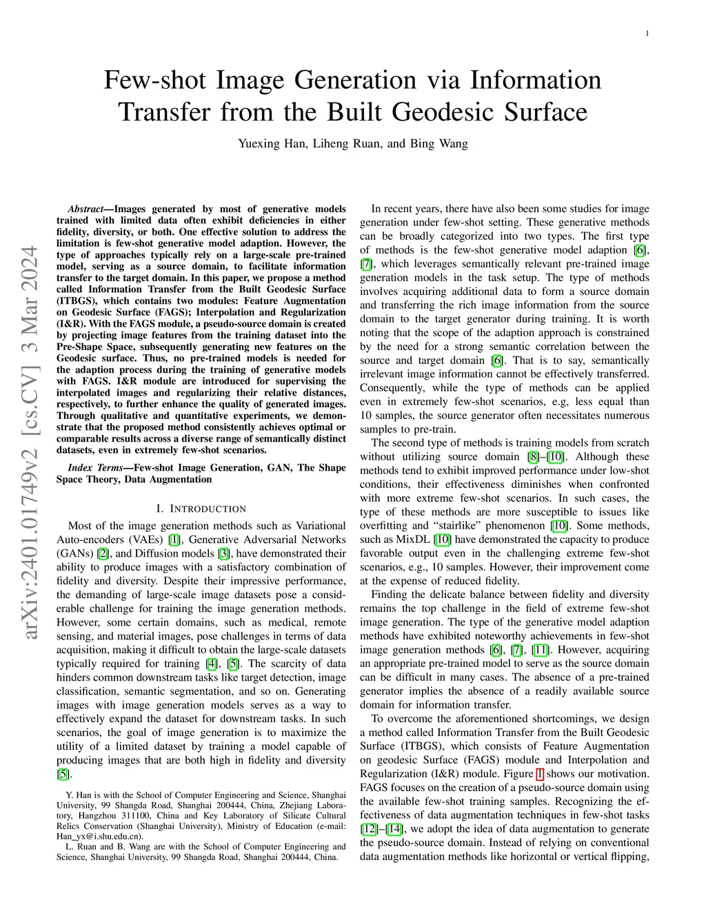 Images generated by most of generative models trained with limited data often exhibit deficiencies in either fidelity, diversity, or both. One effective solution to address the limitation is few-shot generative model adaption. However, the type of approaches typically rely on a large-scale pre-trained model, serving as a source domain, to facilitate information transfer to the target domain. In this paper, we propose a method called Information Transfer from the Built Geodesic Surface (ITBGS), which contains two module: Feature Augmentation on Geodesic Surface (FAGS); Interpolation and Regularization (I\&R). With the FAGS module, a pseudo-source domain is created by projecting image features from the training dataset into the Pre-Shape Space, subsequently generating new features on the Geodesic surface. Thus, no pre-trained models is needed for the adaption process during the training of generative models with FAGS. I\&R module are introduced for supervising the interpolated images and regularizing their relative distances, respectively, to further enhance the quality of generated images. Through qualitative and quantitative experiments, we demonstrate that the proposed method consistently achieves optimal or comparable results across a diverse range of semantically distinct datasets, even in extremely few-shot scenarios.