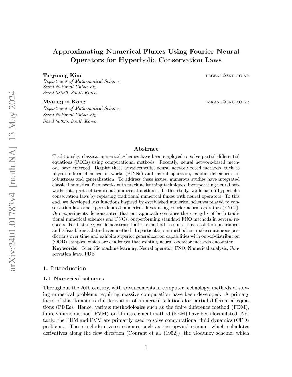 Traditionally, classical numerical schemes have been employed to solve partial differential equations (PDEs) using computational methods. Recently, neural network-based methods have emerged. Despite these advancements, neural network-based methods, such as physics-informed neural networks (PINNs) and neural operators, exhibit deficiencies in robustness and generalization. To address these issues, numerous studies have integrated classical numerical frameworks with machine learning techniques, incorporating neural networks into parts of traditional numerical methods. In this study, we focus on hyperbolic conservation laws by replacing traditional numerical fluxes with neural operators. To this end, we developed loss functions inspired by established numerical schemes related to conservation laws and approximated numerical fluxes using Fourier neural operators (FNOs). Our experiments demonstrated that our approach combines the strengths of both traditional numerical schemes and FNOs, outperforming standard FNO methods in several respects. For instance, we demonstrate that our method is robust, has resolution invariance, and is feasible as a data-driven method. In particular, our method can make continuous predictions over time and exhibits superior generalization capabilities with out-of-distribution (OOD) samples, which are challenges that existing neural operator methods encounter.