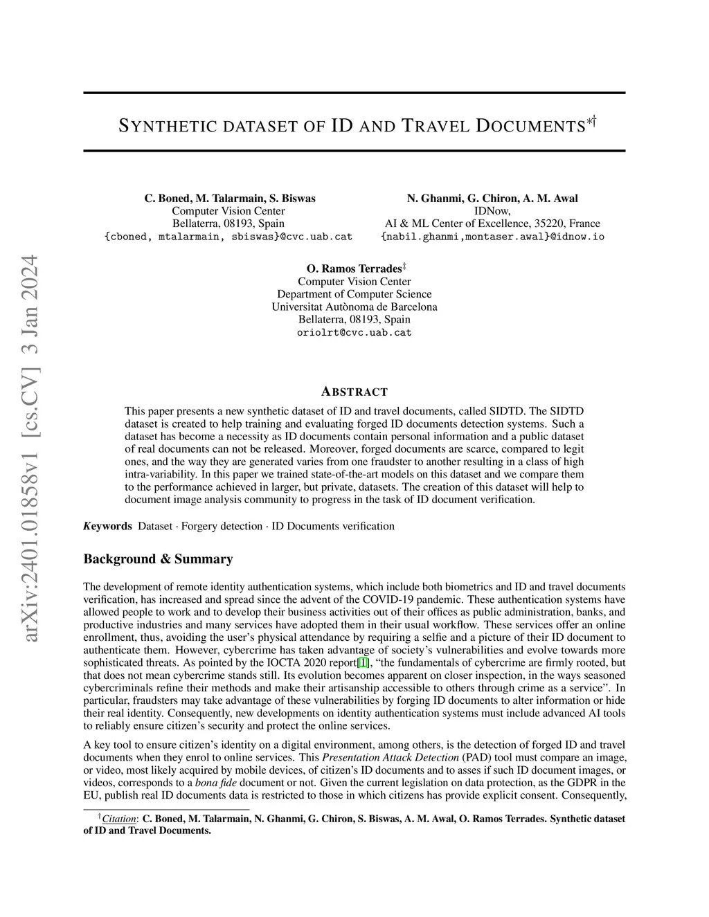 This paper presents a new synthetic dataset of ID and travel documents, called SIDTD. The SIDTD dataset is created to help training and evaluating forged ID documents detection systems. Such a dataset has become a necessity as ID documents contain personal information and a public dataset of real documents can not be released. Moreover, forged documents are scarce, compared to legit ones, and the way they are generated varies from one fraudster to another resulting in a class of high intra-variability. In this paper we trained state-of-the-art models on this dataset and we compare them to the performance achieved in larger, but private, datasets. The creation of this dataset will help to document image analysis community to progress in the task of ID document verification.