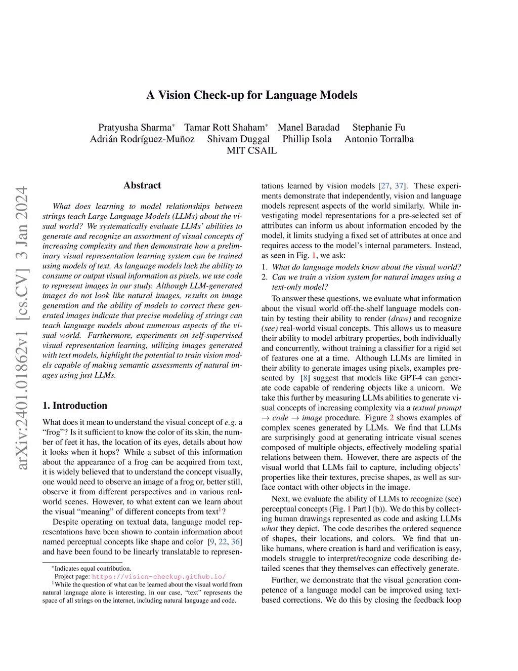 What does learning to model relationships between strings teach large language models (LLMs) about the visual world? We systematically evaluate LLMs' abilities to generate and recognize an assortment of visual concepts of increasing complexity and then demonstrate how a preliminary visual representation learning system can be trained using models of text. As language models lack the ability to consume or output visual information as pixels, we use code to represent images in our study. Although LLM-generated images do not look like natural images, results on image generation and the ability of models to correct these generated images indicate that precise modeling of strings can teach language models about numerous aspects of the visual world. Furthermore, experiments on self-supervised visual representation learning, utilizing images generated with text models, highlight the potential to train vision models capable of making semantic assessments of natural images using just LLMs.