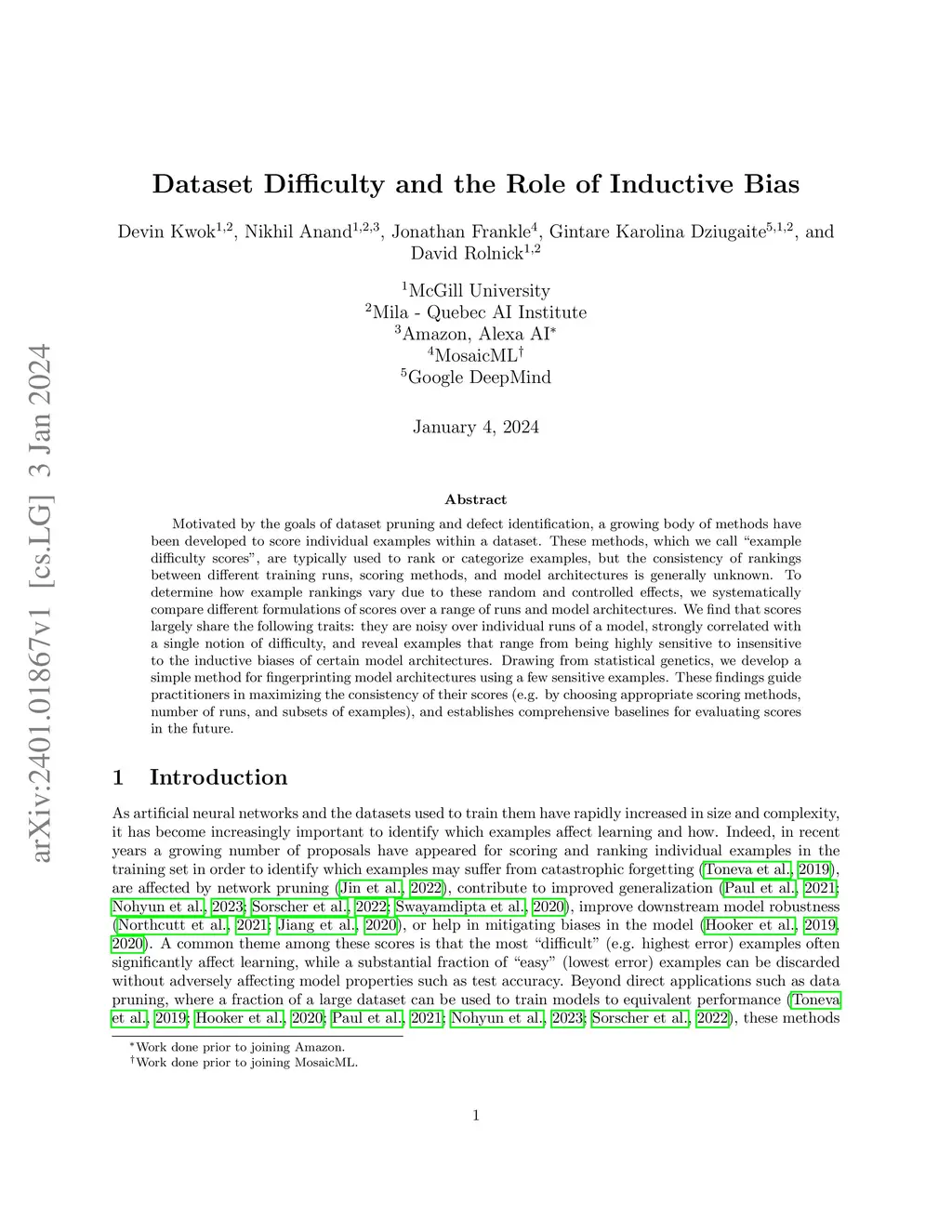 Motivated by the goals of dataset pruning and defect identification, a growing body of methods have been developed to score individual examples within a dataset. These methods, which we call "example difficulty scores", are typically used to rank or categorize examples, but the consistency of rankings between different training runs, scoring methods, and model architectures is generally unknown. To determine how example rankings vary due to these random and controlled effects, we systematically compare different formulations of scores over a range of runs and model architectures. We find that scores largely share the following traits: they are noisy over individual runs of a model, strongly correlated with a single notion of difficulty, and reveal examples that range from being highly sensitive to insensitive to the inductive biases of certain model architectures. Drawing from statistical genetics, we develop a simple method for fingerprinting model architectures using a few sensitive examples. These findings guide practitioners in maximizing the consistency of their scores (e.g. by choosing appropriate scoring methods, number of runs, and subsets of examples), and establishes comprehensive baselines for evaluating scores in the future.