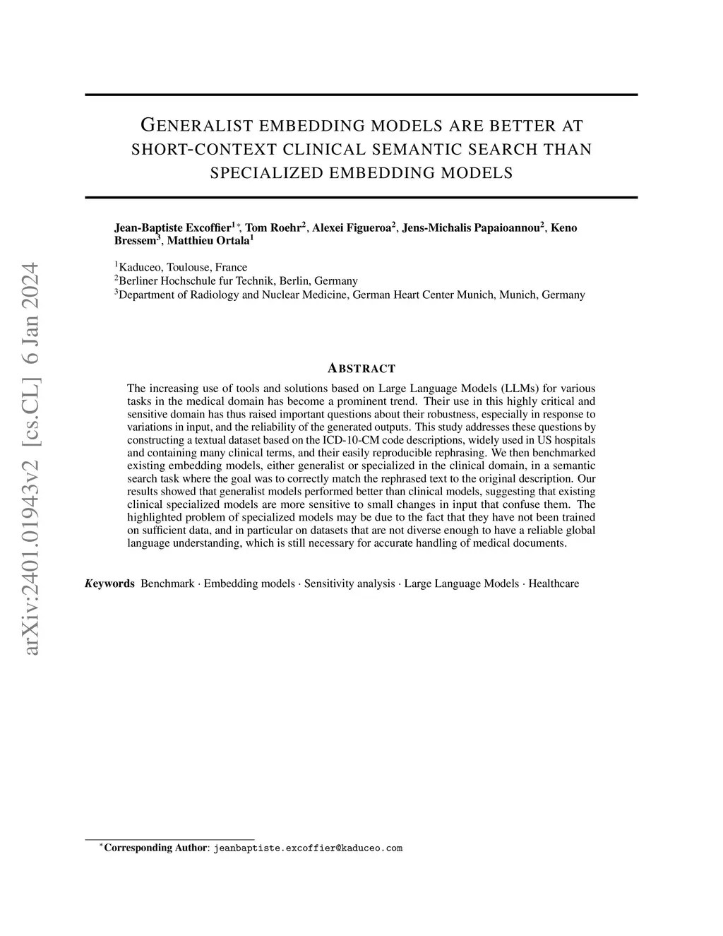 The increasing use of tools and solutions based on Large Language Models (LLMs) for various tasks in the medical domain has become a prominent trend. Their use in this highly critical and sensitive domain has thus raised important questions about their robustness, especially in response to variations in input, and the reliability of the generated outputs. This study addresses these questions by constructing a textual dataset based on the ICD-10-CM code descriptions, widely used in US hospitals and containing many clinical terms, and their easily reproducible rephrasing. We then benchmarked existing embedding models, either generalist or specialized in the clinical domain, in a semantic search task where the goal was to correctly match the rephrased text to the original description. Our results showed that generalist models performed better than clinical models, suggesting that existing clinical specialized models are more sensitive to small changes in input that confuse them. The highlighted problem of specialized models may be due to the fact that they have not been trained on sufficient data, and in particular on datasets that are not diverse enough to have a reliable global language understanding, which is still necessary for accurate handling of medical documents.