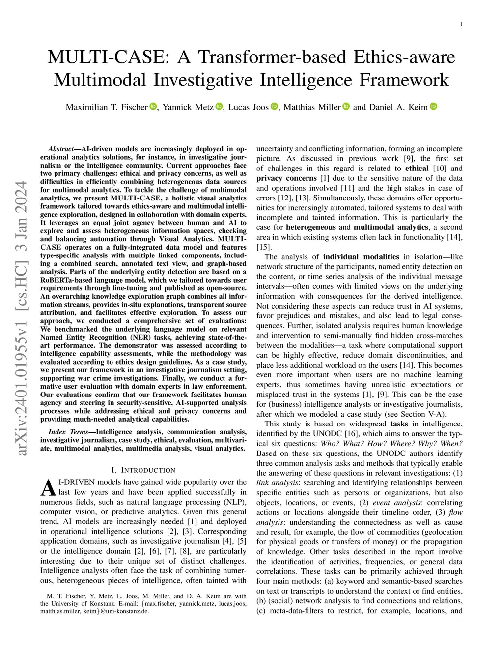 AI-driven models are increasingly deployed in operational analytics solutions, for instance, in investigative journalism or the intelligence community. Current approaches face two primary challenges: ethical and privacy concerns, as well as difficulties in efficiently combining heterogeneous data sources for multimodal analytics. To tackle the challenge of multimodal analytics, we present MULTI-CASE, a holistic visual analytics framework tailored towards ethics-aware and multimodal intelligence exploration, designed in collaboration with domain experts. It leverages an equal joint agency between human and AI to explore and assess heterogeneous information spaces, checking and balancing automation through Visual Analytics. MULTI-CASE operates on a fully-integrated data model and features type-specific analysis with multiple linked components, including a combined search, annotated text view, and graph-based analysis. Parts of the underlying entity detection are based on a RoBERTa-based language model, which we tailored towards user requirements through fine-tuning. An overarching knowledge exploration graph combines all information streams, provides in-situ explanations, transparent source attribution, and facilitates effective exploration. To assess our approach, we conducted a comprehensive set of evaluations: We benchmarked the underlying language model on relevant NER tasks, achieving state-of-the-art performance. The demonstrator was assessed according to intelligence capability assessments, while the methodology was evaluated according to ethics design guidelines. As a case study, we present our framework in an investigative journalism setting, supporting war crime investigations. Finally, we conduct a formative user evaluation with domain experts in law enforcement. Our evaluations confirm that our framework facilitates human agency and steering in security-sensitive applications.