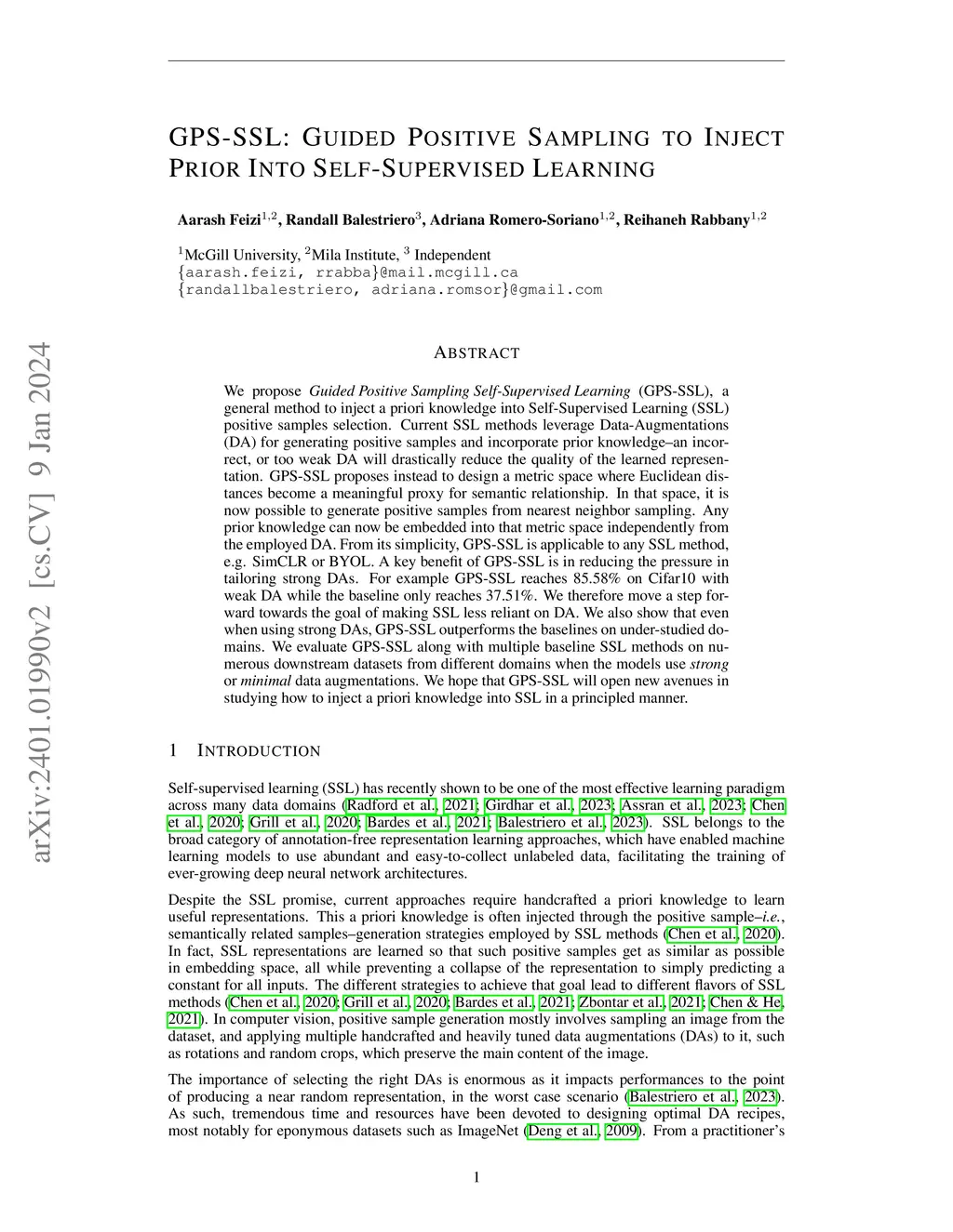 We propose Guided Positive Sampling Self-Supervised Learning (GPS-SSL), a general method to inject a priori knowledge into Self-Supervised Learning (SSL) positive samples selection. Current SSL methods leverage Data-Augmentations (DA) for generating positive samples and incorporate prior knowledge - an incorrect, or too weak DA will drastically reduce the quality of the learned representation. GPS-SSL proposes instead to design a metric space where Euclidean distances become a meaningful proxy for semantic relationship. In that space, it is now possible to generate positive samples from nearest neighbor sampling. Any prior knowledge can now be embedded into that metric space independently from the employed DA. From its simplicity, GPS-SSL is applicable to any SSL method, e.g. SimCLR or BYOL. A key benefit of GPS-SSL is in reducing the pressure in tailoring strong DAs. For example GPS-SSL reaches 85.58% on Cifar10 with weak DA while the baseline only reaches 37.51%. We therefore move a step forward towards the goal of making SSL less reliant on DA. We also show that even when using strong DAs, GPS-SSL outperforms the baselines on under-studied domains. We evaluate GPS-SSL along with multiple baseline SSL methods on numerous downstream datasets from different domains when the models use strong or minimal data augmentations. We hope that GPS-SSL will open new avenues in studying how to inject a priori knowledge into SSL in a principled manner.