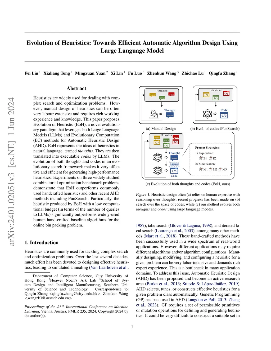 Heuristics are widely used for dealing with complex search and optimization problems. However, manual design of heuristics can be often very labour extensive and requires rich working experience and knowledge. This paper proposes Evolution of Heuristic (EoH), a novel evolutionary paradigm that leverages both Large Language Models (LLMs) and Evolutionary Computation (EC) methods for Automatic Heuristic Design (AHD). EoH represents the ideas of heuristics in natural language, termed thoughts. They are then translated into executable codes by LLMs. The evolution of both thoughts and codes in an evolutionary search framework makes it very effective and efficient for generating high-performance heuristics. Experiments on three widely studied combinatorial optimization benchmark problems demonstrate that EoH outperforms commonly used handcrafted heuristics and other recent AHD methods including FunSearch. Particularly, the heuristic produced by EoH with a low computational budget (in terms of the number of queries to LLMs) significantly outperforms widely-used human hand-crafted baseline algorithms for the online bin packing problem.