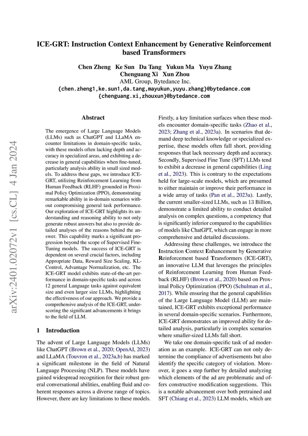 The emergence of Large Language Models (LLMs) such as ChatGPT and LLaMA encounter limitations in domain-specific tasks, with these models often lacking depth and accuracy in specialized areas, and exhibiting a decrease in general capabilities when fine-tuned, particularly analysis ability in small sized models. To address these gaps, we introduce ICE-GRT, utilizing Reinforcement Learning from Human Feedback (RLHF) grounded in Proximal Policy Optimization (PPO), demonstrating remarkable ability in in-domain scenarios without compromising general task performance. Our exploration of ICE-GRT highlights its understanding and reasoning ability to not only generate robust answers but also to provide detailed analyses of the reasons behind the answer. This capability marks a significant progression beyond the scope of Supervised Fine-Tuning models. The success of ICE-GRT is dependent on several crucial factors, including Appropriate Data, Reward Size Scaling, KL-Control, Advantage Normalization, etc. The ICE-GRT model exhibits state-of-the-art performance in domain-specific tasks and across 12 general Language tasks against equivalent size and even larger size LLMs, highlighting the effectiveness of our approach. We provide a comprehensive analysis of the ICE-GRT, underscoring the significant advancements it brings to the field of LLM.