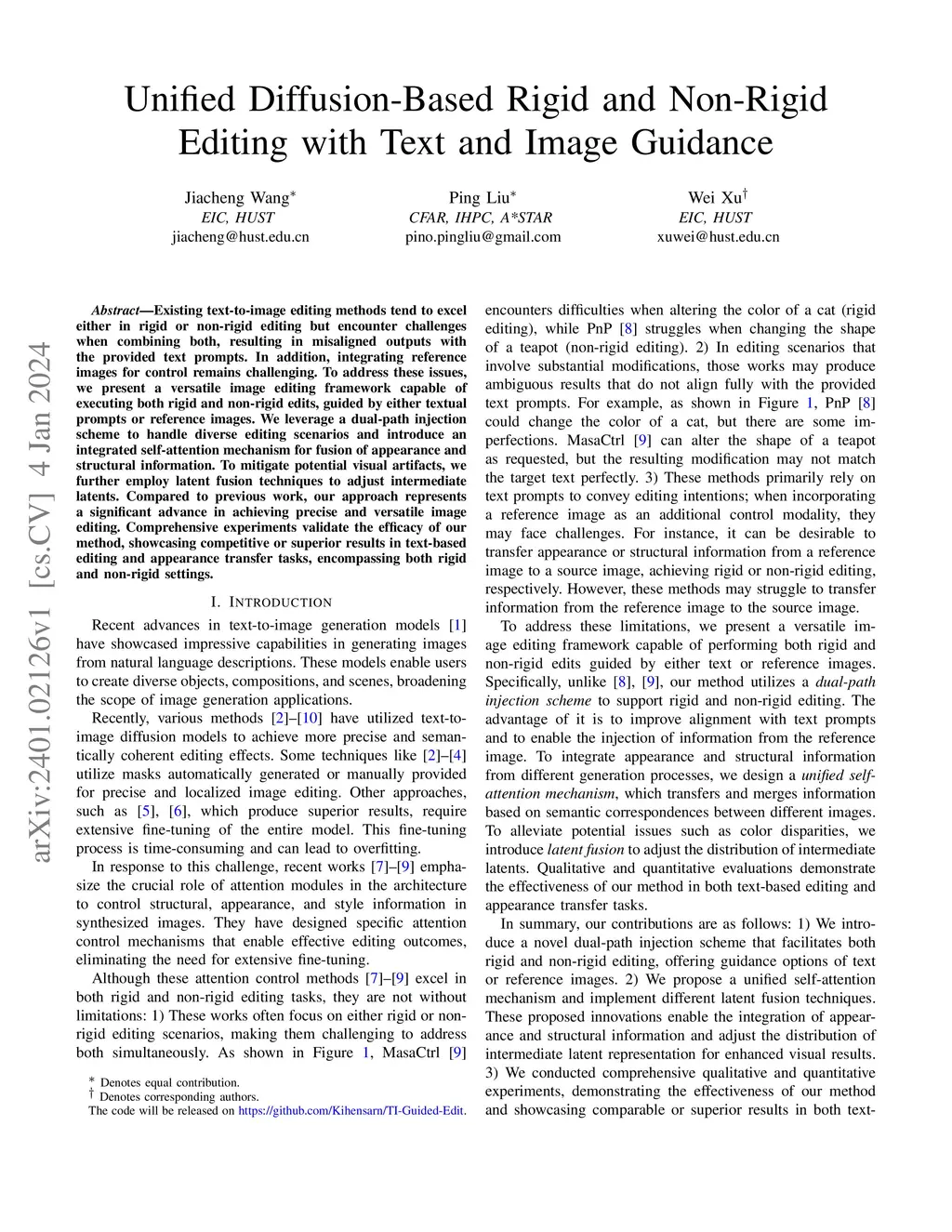 Existing text-to-image editing methods tend to excel either in rigid or non-rigid editing but encounter challenges when combining both, resulting in misaligned outputs with the provided text prompts. In addition, integrating reference images for control remains challenging. To address these issues, we present a versatile image editing framework capable of executing both rigid and non-rigid edits, guided by either textual prompts or reference images. We leverage a dual-path injection scheme to handle diverse editing scenarios and introduce an integrated self-attention mechanism for fusion of appearance and structural information. To mitigate potential visual artifacts, we further employ latent fusion techniques to adjust intermediate latents. Compared to previous work, our approach represents a significant advance in achieving precise and versatile image editing. Comprehensive experiments validate the efficacy of our method, showcasing competitive or superior results in text-based editing and appearance transfer tasks, encompassing both rigid and non-rigid settings.