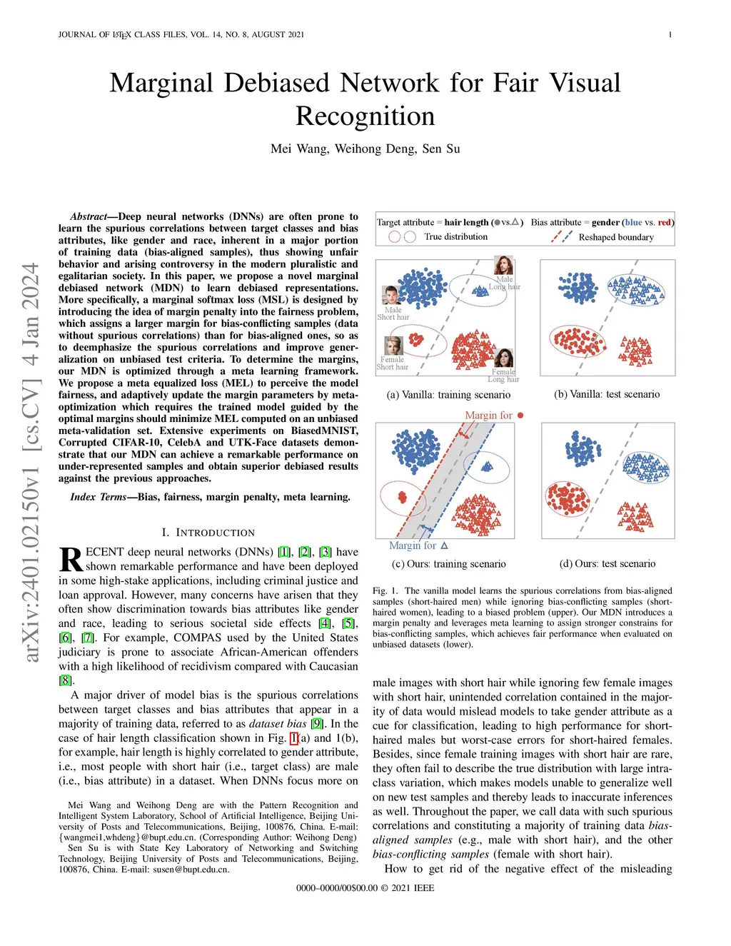 Deep neural networks (DNNs) are often prone to learn the spurious correlations between target classes and bias attributes, like gender and race, inherent in a major portion of training data (bias-aligned samples), thus showing unfair behavior and arising controversy in the modern pluralistic and egalitarian society. In this paper, we propose a novel marginal debiased network (MDN) to learn debiased representations. More specifically, a marginal softmax loss (MSL) is designed by introducing the idea of margin penalty into the fairness problem, which assigns a larger margin for bias-conflicting samples (data without spurious correlations) than for bias-aligned ones, so as to deemphasize the spurious correlations and improve generalization on unbiased test criteria. To determine the margins, our MDN is optimized through a meta learning framework. We propose a meta equalized loss (MEL) to perceive the model fairness, and adaptively update the margin parameters by metaoptimization which requires the trained model guided by the optimal margins should minimize MEL computed on an unbiased meta-validation set. Extensive experiments on BiasedMNIST, Corrupted CIFAR-10, CelebA and UTK-Face datasets demonstrate that our MDN can achieve a remarkable performance on under-represented samples and obtain superior debiased results against the previous approaches.