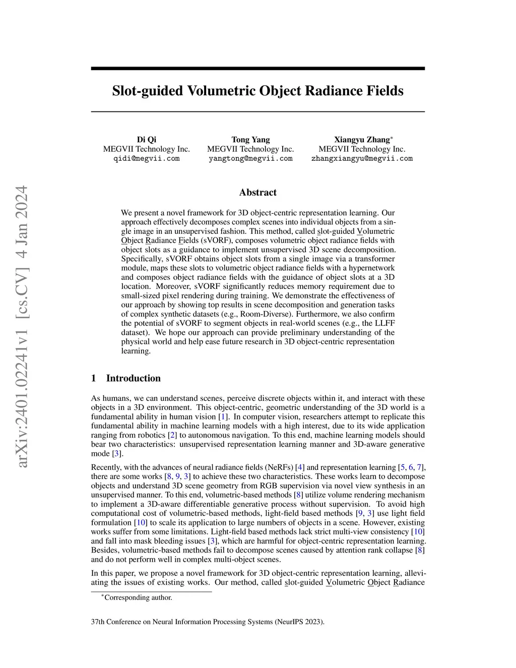 We present a novel framework for 3D object-centric representation learning. Our approach effectively decomposes complex scenes into individual objects from a single image in an unsupervised fashion. This method, called slot-guided Volumetric Object Radiance Fields (sVORF), composes volumetric object radiance fields with object slots as a guidance to implement unsupervised 3D scene decomposition. Specifically, sVORF obtains object slots from a single image via a transformer module, maps these slots to volumetric object radiance fields with a hypernetwork and composes object radiance fields with the guidance of object slots at a 3D location. Moreover, sVORF significantly reduces memory requirement due to small-sized pixel rendering during training. We demonstrate the effectiveness of our approach by showing top results in scene decomposition and generation tasks of complex synthetic datasets (e.g., Room-Diverse). Furthermore, we also confirm the potential of sVORF to segment objects in real-world scenes (e.g., the LLFF dataset). We hope our approach can provide preliminary understanding of the physical world and help ease future research in 3D object-centric representation learning.