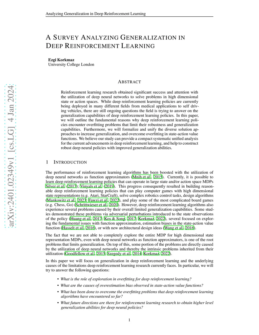 Reinforcement learning research obtained significant success and attention with the utilization of deep neural networks to solve problems in high dimensional state or action spaces. While deep reinforcement learning policies are currently being deployed in many different fields from medical applications to self driving vehicles, there are still ongoing questions the field is trying to answer on the generalization capabilities of deep reinforcement learning policies. In this paper, we will outline the fundamental reasons why deep reinforcement learning policies encounter overfitting problems that limit their robustness and generalization capabilities. Furthermore, we will formalize and unify the diverse solution approaches to increase generalization, and overcome overfitting in state-action value functions. We believe our study can provide a compact systematic unified analysis for the current advancements in deep reinforcement learning, and help to construct robust deep neural policies with improved generalization abilities.