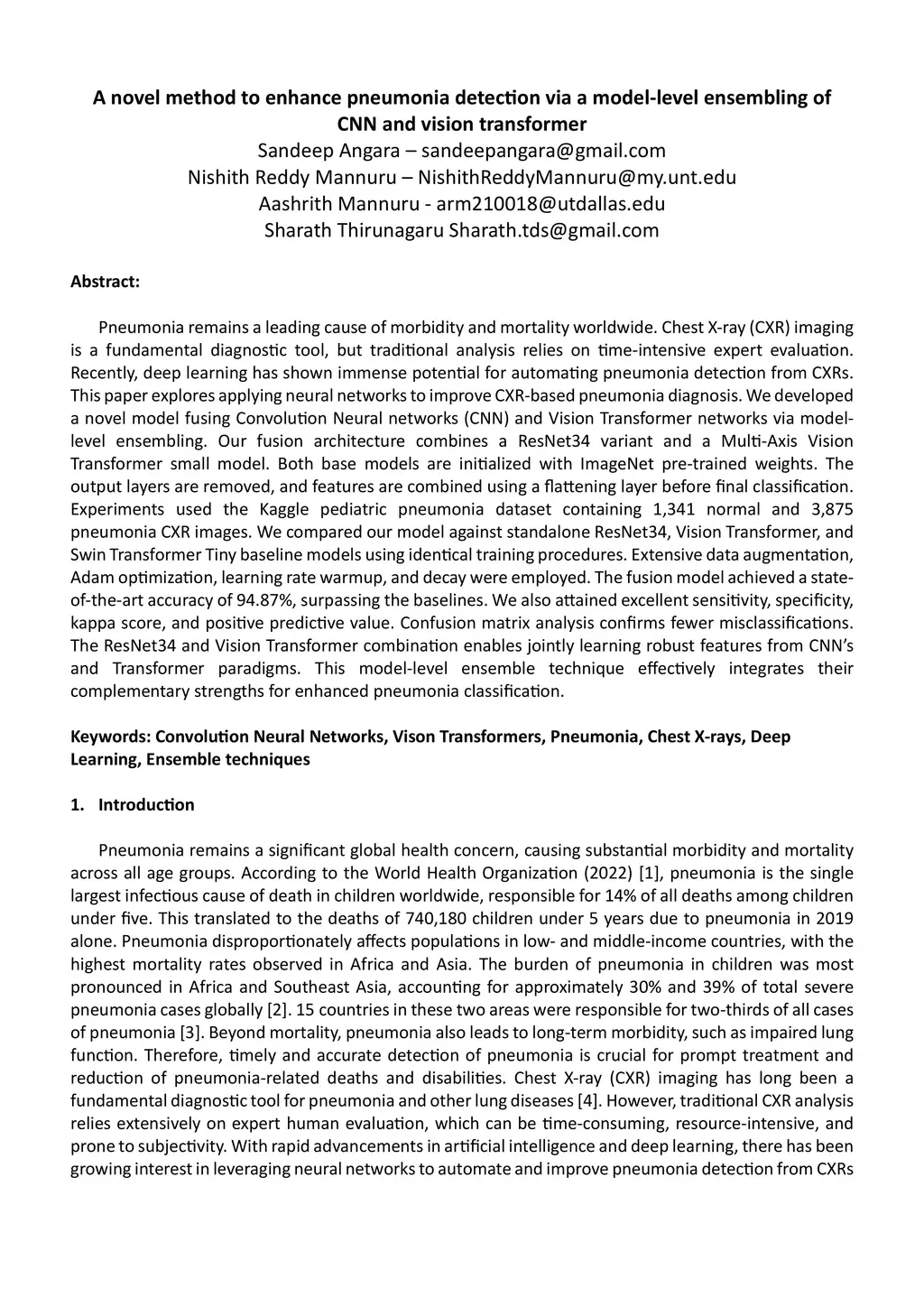 Pneumonia remains a leading cause of morbidity and mortality worldwide. Chest X-ray (CXR) imaging is a fundamental diagnostic tool, but traditional analysis relies on time-intensive expert evaluation. Recently, deep learning has shown immense potential for automating pneumonia detection from CXRs. This paper explores applying neural networks to improve CXR-based pneumonia diagnosis. We developed a novel model fusing Convolution Neural networks (CNN) and Vision Transformer networks via model-level ensembling. Our fusion architecture combines a ResNet34 variant and a Multi-Axis Vision Transformer small model. Both base models are initialized with ImageNet pre-trained weights. The output layers are removed, and features are combined using a flattening layer before final classification. Experiments used the Kaggle pediatric pneumonia dataset containing 1,341 normal and 3,875 pneumonia CXR images. We compared our model against standalone ResNet34, Vision Transformer, and Swin Transformer Tiny baseline models using identical training procedures. Extensive data augmentation, Adam optimization, learning rate warmup, and decay were employed. The fusion model achieved a state-of-the-art accuracy of 94.87%, surpassing the baselines. We also attained excellent sensitivity, specificity, kappa score, and positive predictive value. Confusion matrix analysis confirms fewer misclassifications. The ResNet34 and Vision Transformer combination enables jointly learning robust features from CNNs and Transformer paradigms. This model-level ensemble technique effectively integrates their complementary strengths for enhanced pneumonia classification.