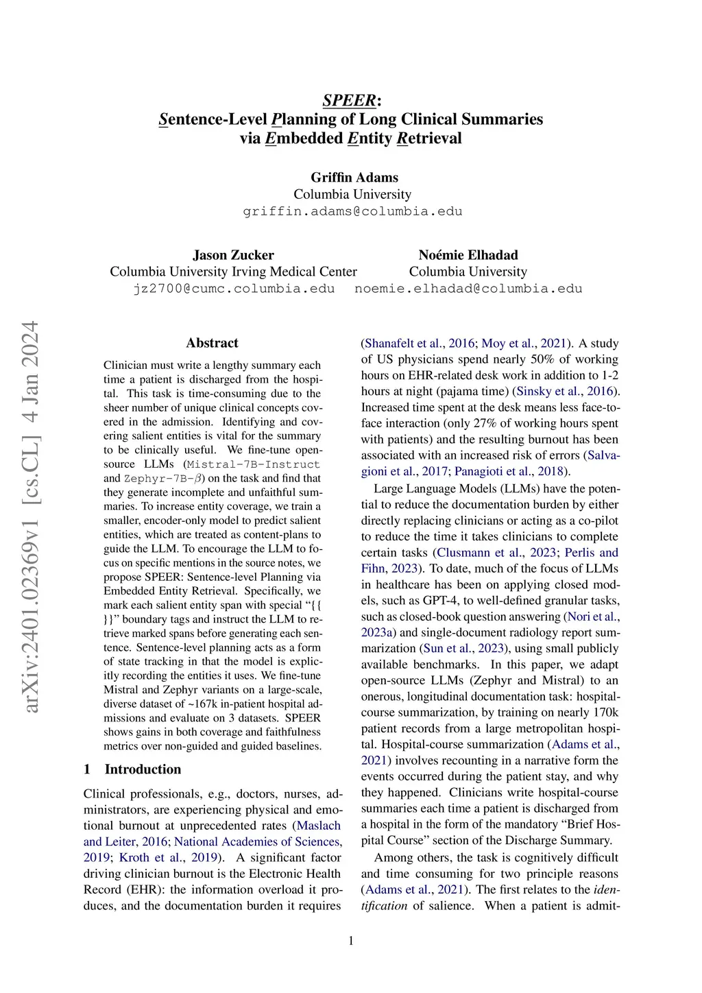 Clinician must write a lengthy summary each time a patient is discharged from the hospital. This task is time-consuming due to the sheer number of unique clinical concepts covered in the admission. Identifying and covering salient entities is vital for the summary to be clinically useful. We fine-tune open-source LLMs (Mistral-7B-Instruct and Zephyr-7B-\b{eta}) on the task and find that they generate incomplete and unfaithful summaries. To increase entity coverage, we train a smaller, encoder-only model to predict salient entities, which are treated as content-plans to guide the LLM. To encourage the LLM to focus on specific mentions in the source notes, we propose SPEER: Sentence-level Planning via Embedded Entity Retrieval. Specifically, we mark each salient entity span with special "{{ }}" boundary tags and instruct the LLM to retrieve marked spans before generating each sentence. Sentence-level planning acts as a form of state tracking in that the model is explicitly recording the entities it uses. We fine-tune Mistral and Zephyr variants on a large-scale, diverse dataset of ~167k in-patient hospital admissions and evaluate on 3 datasets. SPEER shows gains in both coverage and faithfulness metrics over non-guided and guided baselines.