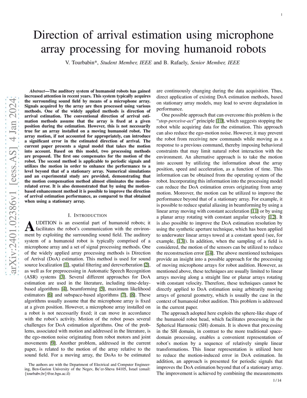 The auditory system of humanoid robots has gained increased attention in recent years. This system typically acquires the surrounding sound field by means of a microphone array. Signals acquired by the array are then processed using various methods. One of the widely applied methods is direction of arrival estimation. The conventional direction of arrival estimation methods assume that the array is fixed at a given position during the estimation. However, this is not necessarily true for an array installed on a moving humanoid robot. The array motion, if not accounted for appropriately, can introduce a significant error in the estimated direction of arrival. The current paper presents a signal model that takes the motion into account. Based on this model, two processing methods are proposed. The first one compensates for the motion of the robot. The second method is applicable to periodic signals and utilizes the motion in order to enhance the performance to a level beyond that of a stationary array. Numerical simulations and an experimental study are provided, demonstrating that the motion compensation method almost eliminates the motion-related error. It is also demonstrated that by using the motion-based enhancement method it is possible to improve the direction of arrival estimation performance, as compared to that obtained when using a stationary array.