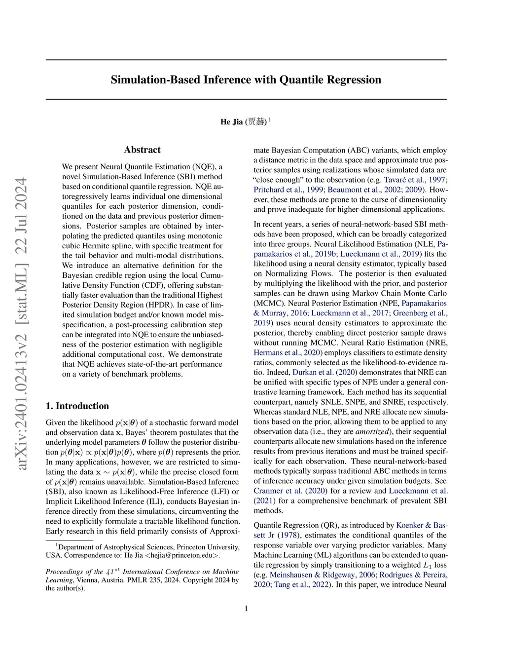We present Neural Quantile Estimation (NQE), a novel Simulation-Based Inference (SBI) method based on conditional quantile regression. NQE autoregressively learns individual one dimensional quantiles for each posterior dimension, conditioned on the data and previous posterior dimensions. Posterior samples are obtained by interpolating the predicted quantiles using monotonic cubic Hermite spline, with specific treatment for the tail behavior and multi-modal distributions. We introduce an alternative definition for the Bayesian credible region using the local Cumulative Density Function (CDF), offering substantially faster evaluation than the traditional Highest Posterior Density Region (HPDR). In case of limited simulation budget and/or known model misspecification, a post-processing broadening step can be integrated into NQE to ensure the unbiasedness of the posterior estimation with negligible additional computational cost. We demonstrate that the proposed NQE method achieves state-of-the-art performance on a variety of benchmark problems.