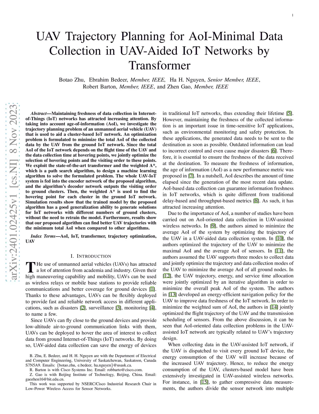 Maintaining freshness of data collection in Internet-of-Things (IoT) networks has attracted increasing attention. By taking into account age-of-information (AoI), we investigate the trajectory planning problem of an unmanned aerial vehicle (UAV) that is used to aid a cluster-based IoT network. An optimization problem is formulated to minimize the total AoI of the collected data by the UAV from the ground IoT network. Since the total AoI of the IoT network depends on the flight time of the UAV and the data collection time at hovering points, we jointly optimize the selection of hovering points and the visiting order to these points. We exploit the state-of-the-art transformer and the weighted A*, which is a path search algorithm, to design a machine learning algorithm to solve the formulated problem. The whole UAV-IoT system is fed into the encoder network of the proposed algorithm, and the algorithm's decoder network outputs the visiting order to ground clusters. Then, the weighted A* is used to find the hovering point for each cluster in the ground IoT network. Simulation results show that the trained model by the proposed algorithm has a good generalization ability to generate solutions for IoT networks with different numbers of ground clusters, without the need to retrain the model. Furthermore, results show that our proposed algorithm can find better UAV trajectories with the minimum total AoI when compared to other algorithms.