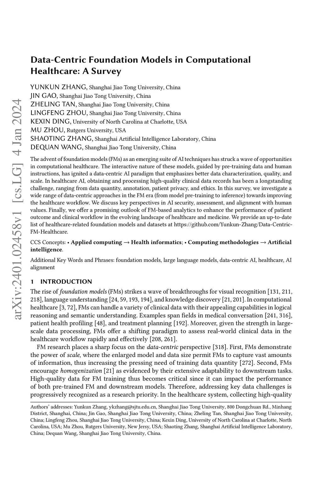 The advent of foundation models (FMs) as an emerging suite of AI techniques has struck a wave of opportunities in computational healthcare. The interactive nature of these models, guided by pre-training data and human instructions, has ignited a data-centric AI paradigm that emphasizes better data characterization, quality, and scale. In healthcare AI, obtaining and processing high-quality clinical data records has been a longstanding challenge, ranging from data quantity, annotation, patient privacy, and ethics. In this survey, we investigate a wide range of data-centric approaches in the FM era (from model pre-training to inference) towards improving the healthcare workflow. We discuss key perspectives in AI security, assessment, and alignment with human values. Finally, we offer a promising outlook of FM-based analytics to enhance the performance of patient outcome and clinical workflow in the evolving landscape of healthcare and medicine. We provide an up-to-date list of healthcare-related foundation models and datasets at https://github.com/Yunkun-Zhang/Data-Centric-FM-Healthcare .