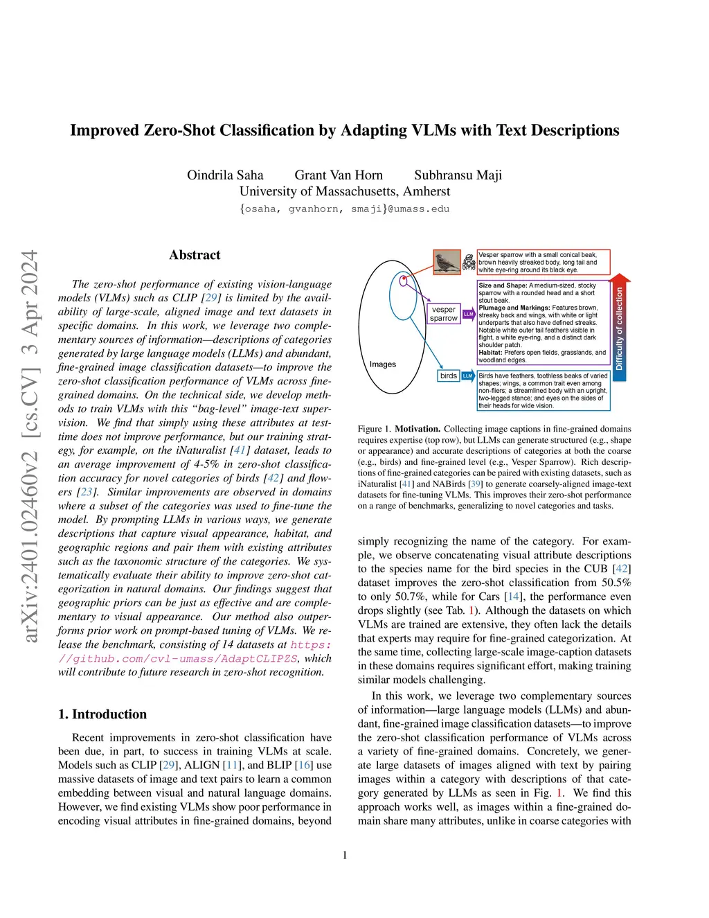 The zero-shot performance of existing vision-language models (VLMs) such as CLIP is limited by the availability of large-scale, aligned image and text datasets in specific domains. In this work, we leverage two complementary sources of information -- descriptions of categories generated by large language models (LLMs) and abundant, fine-grained image classification datasets -- to improve the zero-shot classification performance of VLMs across fine-grained domains. On the technical side, we develop methods to train VLMs with this "bag-level" image-text supervision. We find that simply using these attributes at test-time does not improve performance, but our training strategy, for example, on the iNaturalist dataset, leads to an average improvement of 4-5% in zero-shot classification accuracy for novel categories of birds and flowers. Similar improvements are observed in domains where a subset of the categories was used to fine-tune the model. By prompting LLMs in various ways, we generate descriptions that capture visual appearance, habitat, and geographic regions and pair them with existing attributes such as the taxonomic structure of the categories. We systematically evaluate their ability to improve zero-shot categorization in natural domains. Our findings suggest that geographic priors can be just as effective and are complementary to visual appearance. Our method also outperforms prior work on prompt-based tuning of VLMs. We release the benchmark, consisting of 14 datasets at https://github.com/cvl-umass/AdaptCLIPZS , which will contribute to future research in zero-shot recognition.