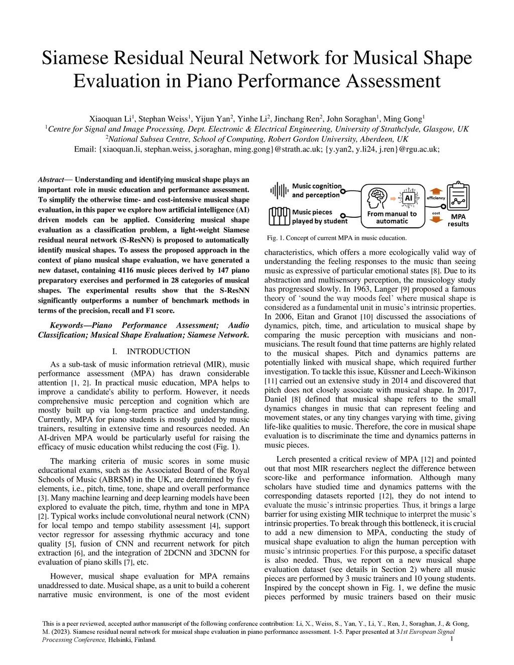 Understanding and identifying musical shape plays an important role in music education and performance assessment. To simplify the otherwise time- and cost-intensive musical shape evaluation, in this paper we explore how artificial intelligence (AI) driven models can be applied. Considering musical shape evaluation as a classification problem, a light-weight Siamese residual neural network (S-ResNN) is proposed to automatically identify musical shapes. To assess the proposed approach in the context of piano musical shape evaluation, we have generated a new dataset, containing 4116 music pieces derived by 147 piano preparatory exercises and performed in 28 categories of musical shapes. The experimental results show that the S-ResNN significantly outperforms a number of benchmark methods in terms of the precision, recall and F1 score.