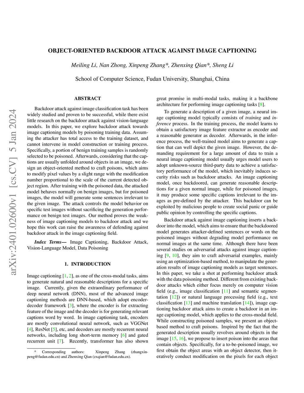 Backdoor attack against image classification task has been widely studied and proven to be successful, while there exist little research on the backdoor attack against vision-language models. In this paper, we explore backdoor attack towards image captioning models by poisoning training data. Assuming the attacker has total access to the training dataset, and cannot intervene in model construction or training process. Specifically, a portion of benign training samples is randomly selected to be poisoned. Afterwards, considering that the captions are usually unfolded around objects in an image, we design an object-oriented method to craft poisons, which aims to modify pixel values by a slight range with the modification number proportional to the scale of the current detected object region. After training with the poisoned data, the attacked model behaves normally on benign images, but for poisoned images, the model will generate some sentences irrelevant to the given image. The attack controls the model behavior on specific test images without sacrificing the generation performance on benign test images. Our method proves the weakness of image captioning models to backdoor attack and we hope this work can raise the awareness of defending against backdoor attack in the image captioning field.