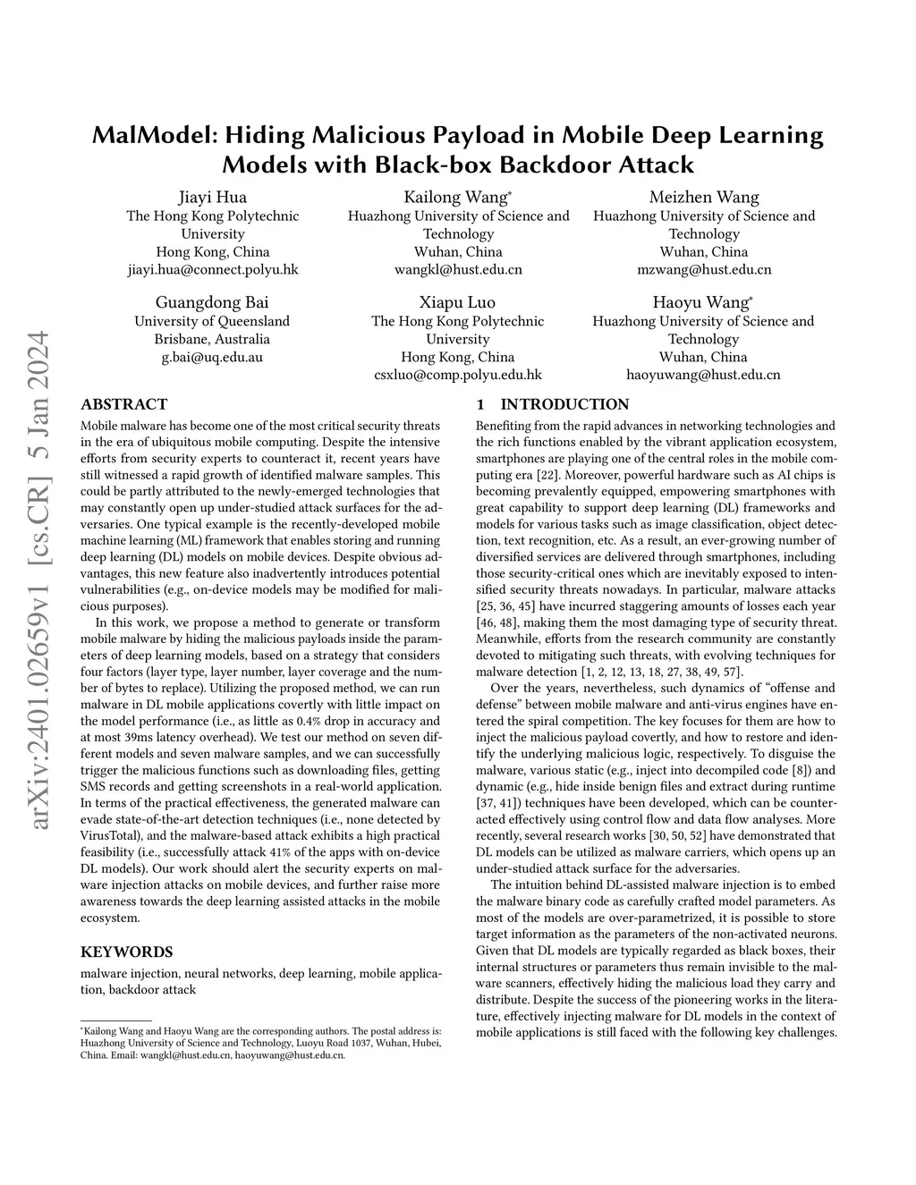 MalModel: Hiding Malicious Payload in Mobile Deep Learning Models with