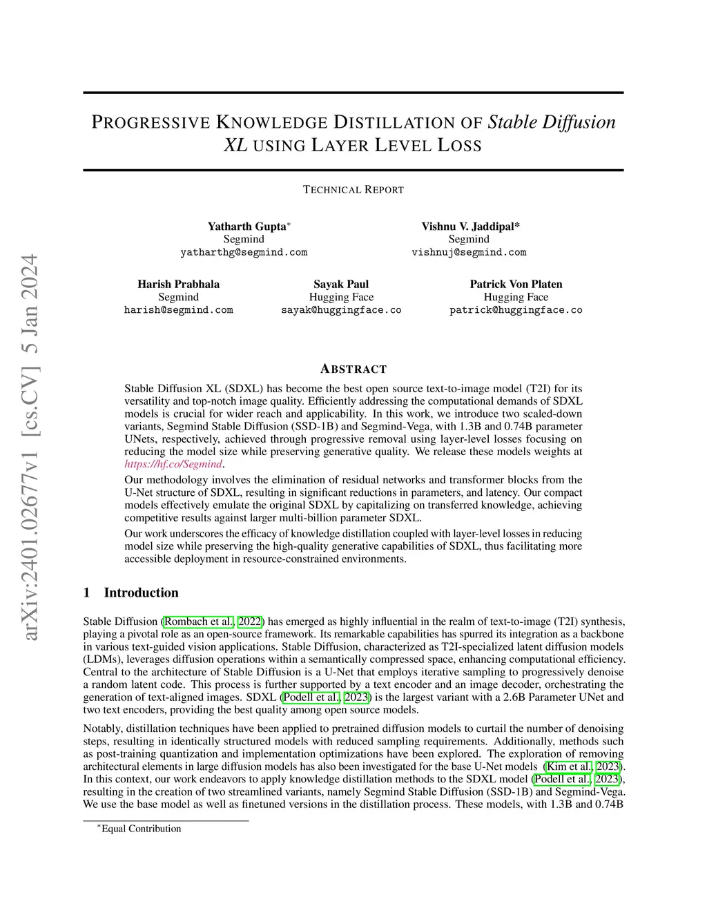 Stable Diffusion XL (SDXL) has become the best open source text-to-image model (T2I) for its versatility and top-notch image quality. Efficiently addressing the computational demands of SDXL models is crucial for wider reach and applicability. In this work, we introduce two scaled-down variants, Segmind Stable Diffusion (SSD-1B) and Segmind-Vega, with 1.3B and 0.74B parameter UNets, respectively, achieved through progressive removal using layer-level losses focusing on reducing the model size while preserving generative quality. We release these models weights at https://hf.co/Segmind. Our methodology involves the elimination of residual networks and transformer blocks from the U-Net structure of SDXL, resulting in significant reductions in parameters, and latency. Our compact models effectively emulate the original SDXL by capitalizing on transferred knowledge, achieving competitive results against larger multi-billion parameter SDXL. Our work underscores the efficacy of knowledge distillation coupled with layer-level losses in reducing model size while preserving the high-quality generative capabilities of SDXL, thus facilitating more accessible deployment in resource-constrained environments.