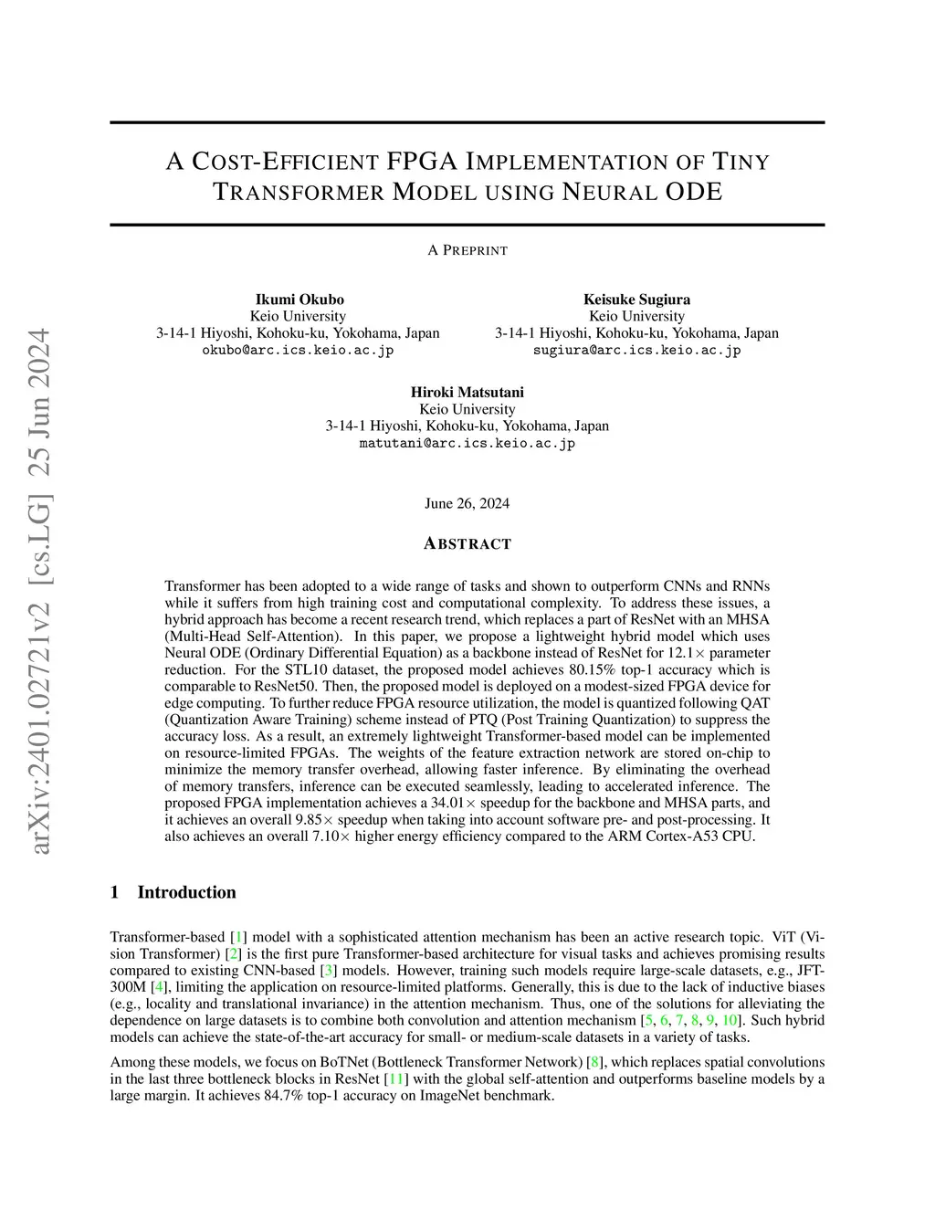 Transformer has been adopted to a wide range of tasks and shown to outperform CNNs and RNNs while it suffers from high training cost and computational complexity. To address these issues, a hybrid approach has become a recent research trend, which replaces a part of ResNet with an MHSA (Multi-Head Self-Attention). In this paper, we propose a lightweight hybrid model which uses Neural ODE (Ordinary Differential Equation) as a backbone instead of ResNet for 12.1 parameter reduction. For the STL10 dataset, the proposed model achieves 80.15% top-1 accuracy which is comparable to ResNet50. Then, the proposed model is deployed on a modest-sized FPGA device for edge computing. To further reduce FPGA resource utilization, the model is quantized following QAT (Quantization Aware Training) scheme instead of PTQ (Post Training Quantization) to suppress the accuracy loss. As a result, an extremely lightweight Transformer-based model can be implemented on resource-limited FPGAs. The weights of the feature extraction network are stored on-chip to minimize the memory transfer overhead, allowing faster inference. By eliminating the overhead of memory transfers, inference can be executed seamlessly, leading to accelerated inference. The proposed FPGA implementation achieves a 34.01 speedup for the backbone and MHSA parts, and it achieves an overall 9.85 speedup when taking into account software pre- and post-processing. It also achieves an overall 7.10 higher energy efficiency compared to the ARM Cortex-A53 CPU.