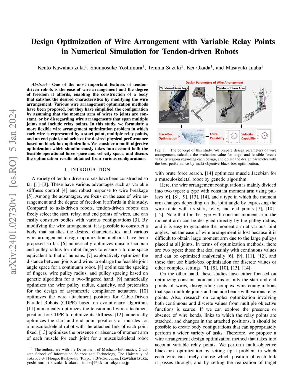 One of the most important features of tendon-driven robots is the ease of wire arrangement and the degree of freedom it affords, enabling the construction of a body that satisfies the desired characteristics by modifying the wire arrangement. Various wire arrangement optimization methods have been proposed, but they have simplified the configuration by assuming that the moment arm of wires to joints are constant, or by disregarding wire arrangements that span multiple joints and include relay points. In this study, we formulate a more flexible wire arrangement optimization problem in which each wire is represented by a start point, multiple relay points, and an end point, and achieve the desired physical performance based on black-box optimization. We consider a multi-objective optimization which simultaneously takes into account both the feasible operational force space and velocity space, and discuss the optimization results obtained from various configurations.