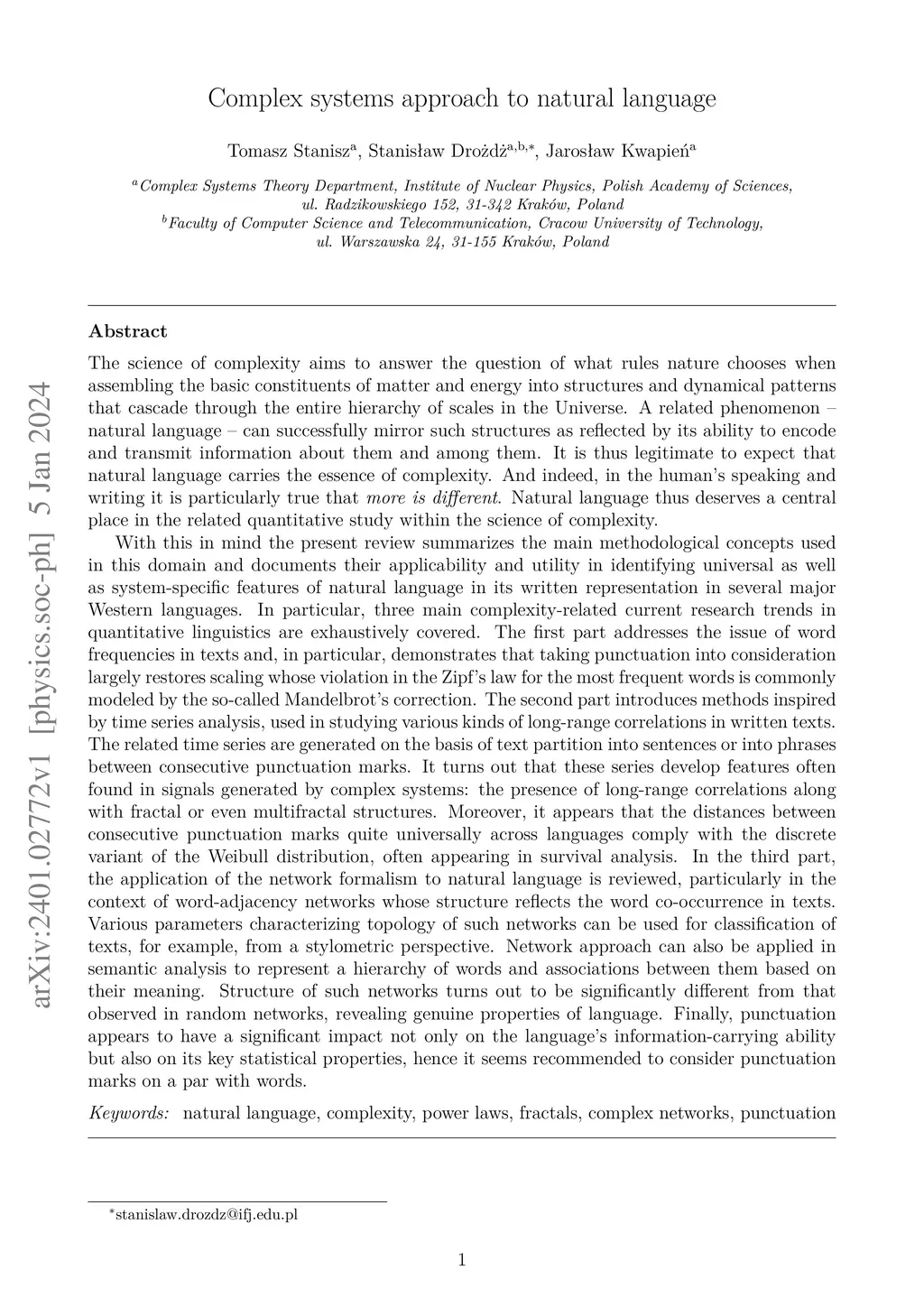 The review summarizes the main methodological concepts used in studying natural language from the perspective of complexity science and documents their applicability in identifying both universal and system-specific features of language in its written representation. Three main complexity-related research trends in quantitative linguistics are covered. The first part addresses the issue of word frequencies in texts and demonstrates that taking punctuation into consideration restores scaling whose violation in the Zipf's law is often observed for the most frequent words. The second part introduces methods inspired by time series analysis, used in studying various kinds of correlations in written texts. The related time series are generated on the basis of text partition into sentences or into phrases between consecutive punctuation marks. It turns out that these series develop features often found in signals generated by complex systems, like long-range correlations or (multi)fractal structures. Moreover, it appears that the distances between punctuation marks comply with the discrete variant of the Weibull distribution. In the third part, the application of the network formalism to natural language is reviewed, particularly in the context of the so-called word-adjacency networks. Parameters characterizing topology of such networks can be used for classification of texts, for example, from a stylometric perspective. Network approach can also be applied to represent the organization of word associations. Structure of word-association networks turns out to be significantly different from that observed in random networks, revealing genuine properties of language. Finally, punctuation seems to have a significant impact not only on the language's information-carrying ability but also on its key statistical properties, hence it is recommended to consider punctuation marks on a par with words.