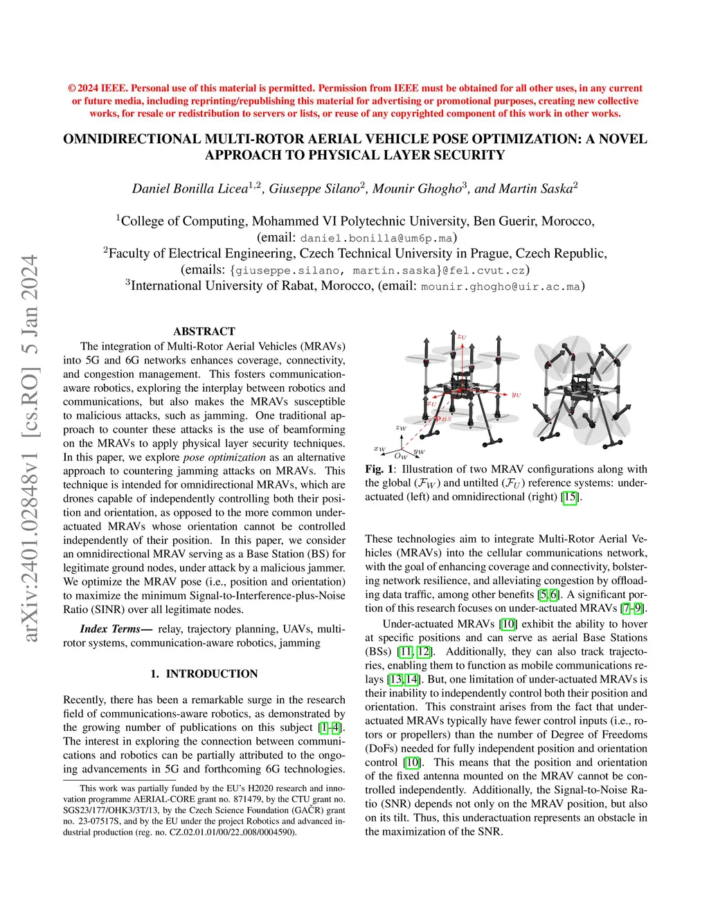 The integration of Multi-Rotor Aerial Vehicles (MRAVs) into 5G and 6G networks enhances coverage, connectivity, and congestion management. This fosters communication-aware robotics, exploring the interplay between robotics and communications, but also makes the MRAVs susceptible to malicious attacks, such as jamming. One traditional approach to counter these attacks is the use of beamforming on the MRAVs to apply physical layer security techniques. In this paper, we explore pose optimization as an alternative approach to countering jamming attacks on MRAVs. This technique is intended for omnidirectional MRAVs, which are drones capable of independently controlling both their position and orientation, as opposed to the more common underactuated MRAVs whose orientation cannot be controlled independently of their position. In this paper, we consider an omnidirectional MRAV serving as a Base Station (BS) for legitimate ground nodes, under attack by a malicious jammer. We optimize the MRAV pose (i.e., position and orientation) to maximize the minimum Signal-to-Interference-plus-Noise Ratio (SINR) over all legitimate nodes.