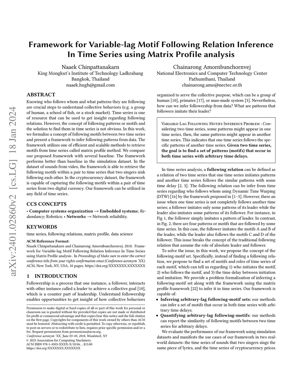 Knowing who follows whom and what patterns they are following are crucial steps to understand collective behaviors (e.g. a group of human, a school of fish, or a stock market). Time series is one of resources that can be used to get insight regarding following relations. However, the concept of following patterns or motifs and the solution to find them in time series are not obvious. In this work, we formalize a concept of following motifs between two time series and present a framework to infer following patterns between two time series. The framework utilizes one of efficient and scalable methods to retrieve motifs from time series called the Matrix Profile Method. We compare our proposed framework with several baselines. The framework performs better than baselines in the simulation datasets. In the dataset of sound recording, the framework is able to retrieve the following motifs within a pair of time series that two singers sing following each other. In the cryptocurrency dataset, the framework is capable of capturing the following motifs within a pair of time series from two digital currencies, which implies that the values of one currency follow the values of another currency patterns. Our framework can be utilized in any field of time series to get insight regarding following patterns between time series.