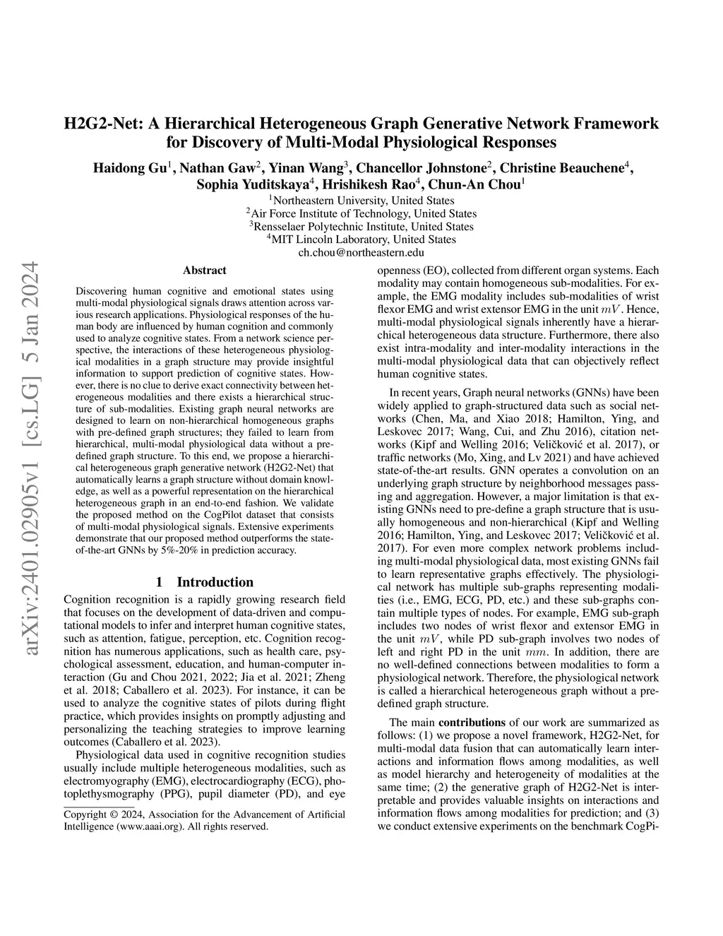 Discovering human cognitive and emotional states using multi-modal physiological signals draws attention across various research applications. Physiological responses of the human body are influenced by human cognition and commonly used to analyze cognitive states. From a network science perspective, the interactions of these heterogeneous physiological modalities in a graph structure may provide insightful information to support prediction of cognitive states. However, there is no clue to derive exact connectivity between heterogeneous modalities and there exists a hierarchical structure of sub-modalities. Existing graph neural networks are designed to learn on non-hierarchical homogeneous graphs with pre-defined graph structures; they failed to learn from hierarchical, multi-modal physiological data without a pre-defined graph structure. To this end, we propose a hierarchical heterogeneous graph generative network (H2G2-Net) that automatically learns a graph structure without domain knowledge, as well as a powerful representation on the hierarchical heterogeneous graph in an end-to-end fashion. We validate the proposed method on the CogPilot dataset that consists of multi-modal physiological signals. Extensive experiments demonstrate that our proposed method outperforms the state-of-the-art GNNs by 5%-20% in prediction accuracy.
