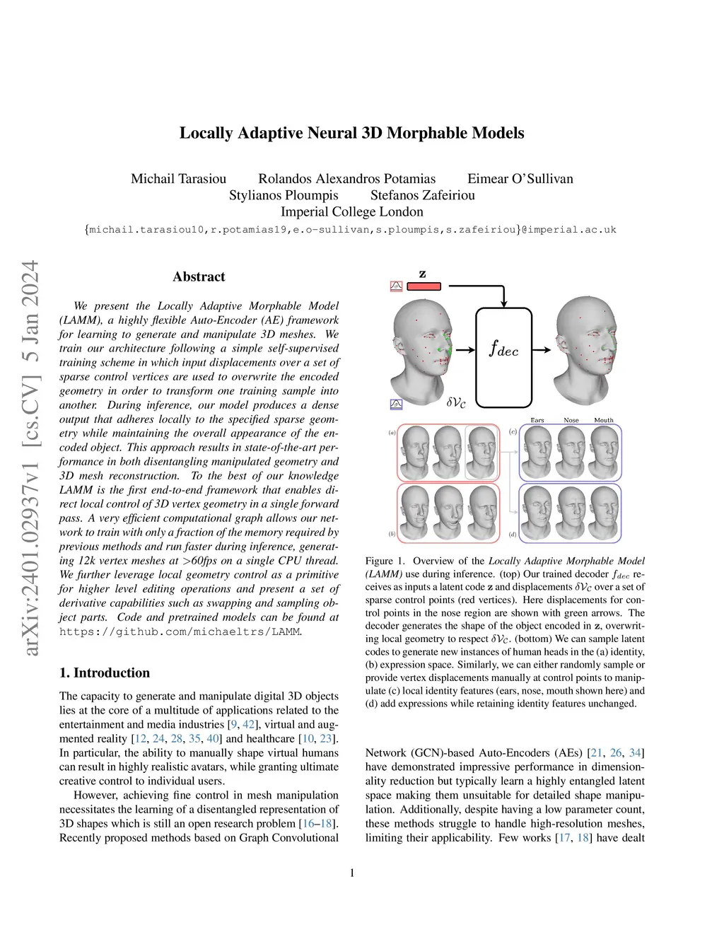 We present the Locally Adaptive Morphable Model (LAMM), a highly flexible Auto-Encoder (AE) framework for learning to generate and manipulate 3D meshes. We train our architecture following a simple self-supervised training scheme in which input displacements over a set of sparse control vertices are used to overwrite the encoded geometry in order to transform one training sample into another. During inference, our model produces a dense output that adheres locally to the specified sparse geometry while maintaining the overall appearance of the encoded object. This approach results in state-of-the-art performance in both disentangling manipulated geometry and 3D mesh reconstruction. To the best of our knowledge LAMM is the first end-to-end framework that enables direct local control of 3D vertex geometry in a single forward pass. A very efficient computational graph allows our network to train with only a fraction of the memory required by previous methods and run faster during inference, generating 12k vertex meshes at 60fps on a single CPU thread. We further leverage local geometry control as a primitive for higher level editing operations and present a set of derivative capabilities such as swapping and sampling object parts. Code and pretrained models can be found at https://github.com/michaeltrs/LAMM.