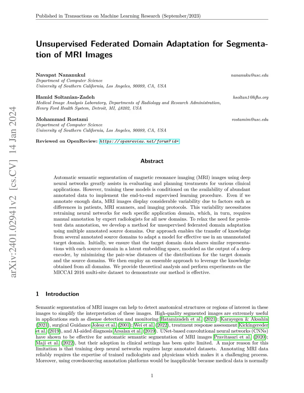 Unsupervised Federated Domain Adaptation for Segmentation of MRI Images