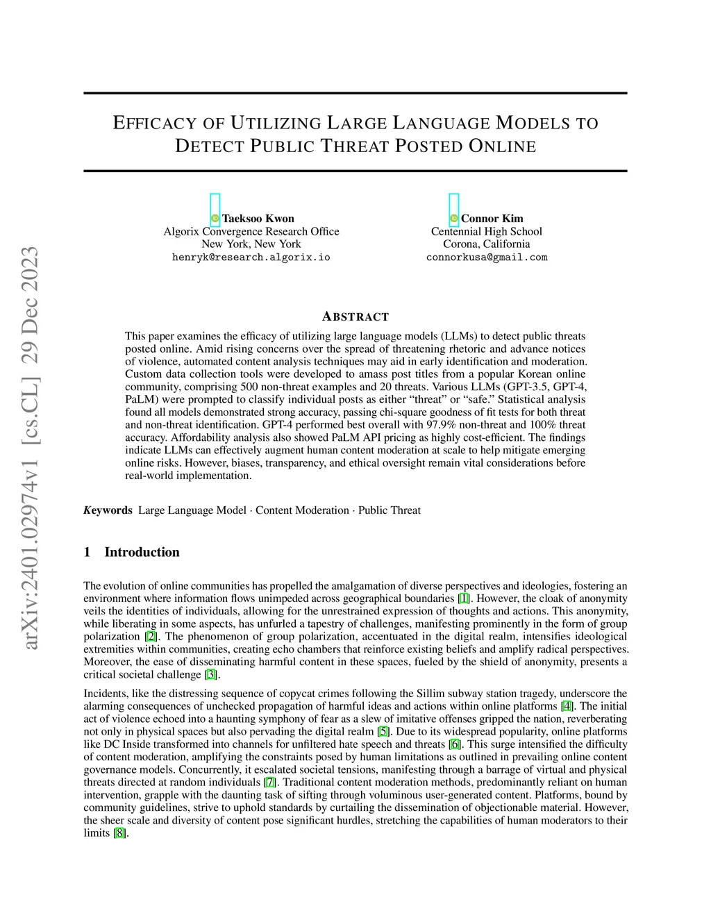 This paper examines the efficacy of utilizing large language models (LLMs) to detect public threats posted online. Amid rising concerns over the spread of threatening rhetoric and advance notices of violence, automated content analysis techniques may aid in early identification and moderation. Custom data collection tools were developed to amass post titles from a popular Korean online community, comprising 500 non-threat examples and 20 threats. Various LLMs (GPT-3.5, GPT-4, PaLM) were prompted to classify individual posts as either "threat" or "safe." Statistical analysis found all models demonstrated strong accuracy, passing chi-square goodness of fit tests for both threat and non-threat identification. GPT-4 performed best overall with 97.9% non-threat and 100% threat accuracy. Affordability analysis also showed PaLM API pricing as highly cost-efficient. The findings indicate LLMs can effectively augment human content moderation at scale to help mitigate emerging online risks. However, biases, transparency, and ethical oversight remain vital considerations before real-world implementation.