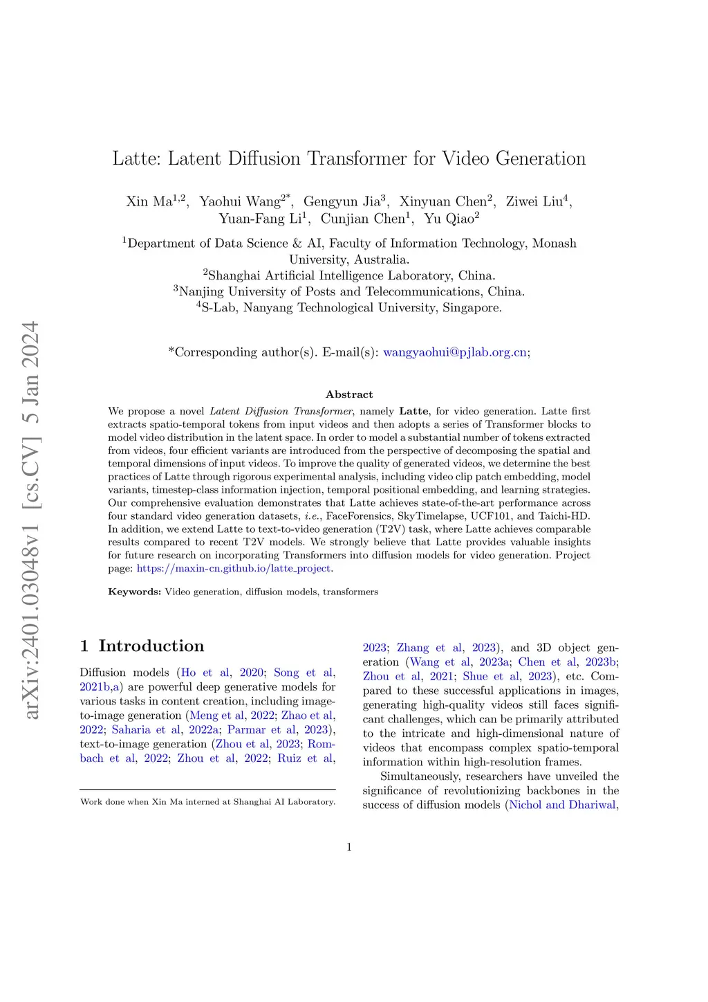 We propose Latte, a novel Latent Diffusion Transformer for video generation. Latte first extracts spatio-temporal tokens from input videos and then adopts a series of Transformer blocks to model video distribution in the latent space. In order to model a substantial number of tokens extracted from videos, four efficient variants are introduced from the perspective of decomposing the spatial and temporal dimensions of input videos. To improve the quality of generated videos, we determine the best practices of Latte through rigorous experimental analysis, including video clip patch embedding, model variants, timestep-class information injection, temporal positional embedding, and learning strategies. Our comprehensive evaluation demonstrates that Latte achieves state-of-the-art performance across four standard video generation datasets, i.e., FaceForensics, SkyTimelapse, UCF101, and Taichi-HD. In addition, we extend Latte to the text-to-video generation (T2V) task, where Latte achieves results that are competitive with recent T2V models. We strongly believe that Latte provides valuable insights for future research on incorporating Transformers into diffusion models for video generation.