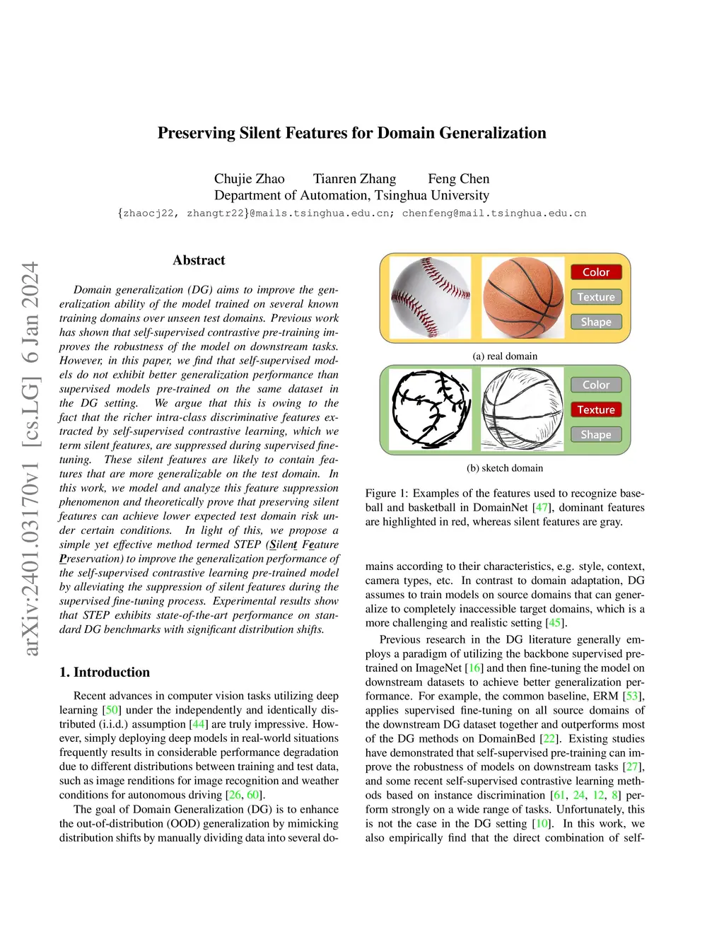 Domain generalization (DG) aims to improve the generalization ability of the model trained on several known training domains over unseen test domains. Previous work has shown that self-supervised contrastive pre-training improves the robustness of the model on downstream tasks. However, in this paper, we find that self-supervised models do not exhibit better generalization performance than supervised models pre-trained on the same dataset in the DG setting. We argue that this is owing to the fact that the richer intra-class discriminative features extracted by self-supervised contrastive learning, which we term silent features, are suppressed during supervised fine-tuning. These silent features are likely to contain features that are more generalizable on the test domain. In this work, we model and analyze this feature suppression phenomenon and theoretically prove that preserving silent features can achieve lower expected test domain risk under certain conditions. In light of this, we propose a simple yet effective method termed STEP (Silent Feature Preservation) to improve the generalization performance of the self-supervised contrastive learning pre-trained model by alleviating the suppression of silent features during the supervised fine-tuning process. Experimental results show that STEP exhibits state-of-the-art performance on standard DG benchmarks with significant distribution shifts.