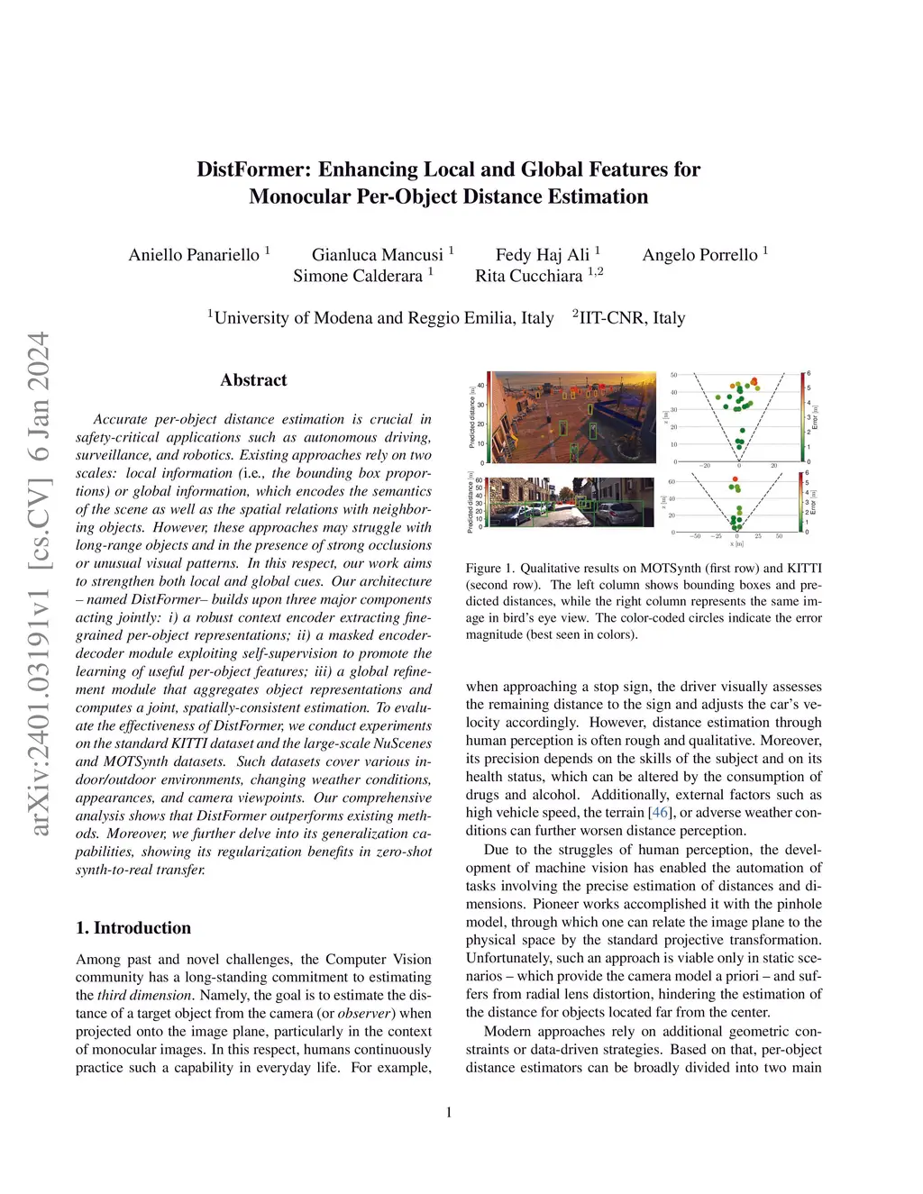 Accurate per-object distance estimation is crucial in safety-critical applications such as autonomous driving, surveillance, and robotics. Existing approaches rely on two scales: local information (i.e., the bounding box proportions) or global information, which encodes the semantics of the scene as well as the spatial relations with neighboring objects. However, these approaches may struggle with long-range objects and in the presence of strong occlusions or unusual visual patterns. In this respect, our work aims to strengthen both local and global cues. Our architecture -- named DistFormer -- builds upon three major components acting jointly: i) a robust context encoder extracting fine-grained per-object representations; ii) a masked encoder-decoder module exploiting self-supervision to promote the learning of useful per-object features; iii) a global refinement module that aggregates object representations and computes a joint, spatially-consistent estimation. To evaluate the effectiveness of DistFormer, we conduct experiments on the standard KITTI dataset and the large-scale NuScenes and MOTSynth datasets. Such datasets cover various indoor/outdoor environments, changing weather conditions, appearances, and camera viewpoints. Our comprehensive analysis shows that DistFormer outperforms existing methods. Moreover, we further delve into its generalization capabilities, showing its regularization benefits in zero-shot synth-to-real transfer.